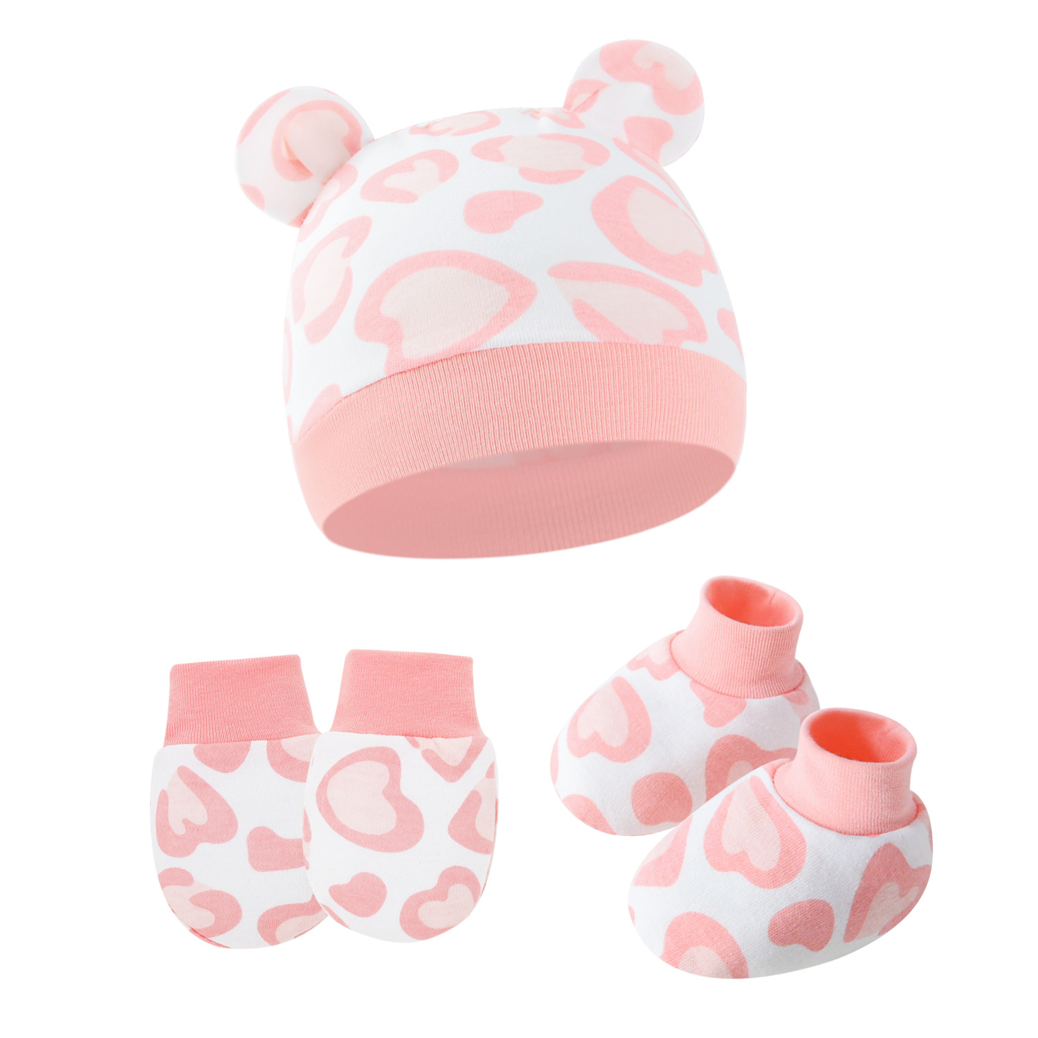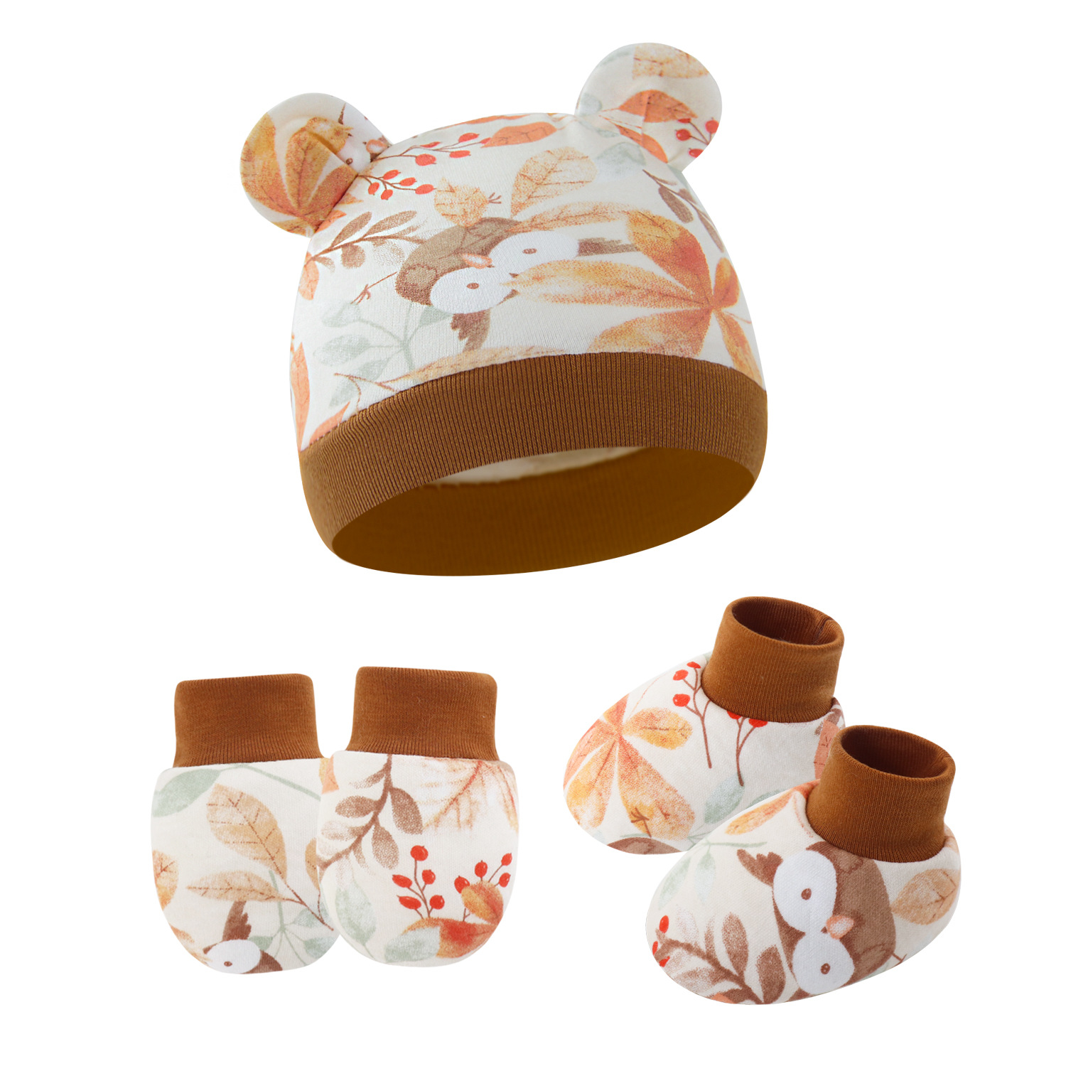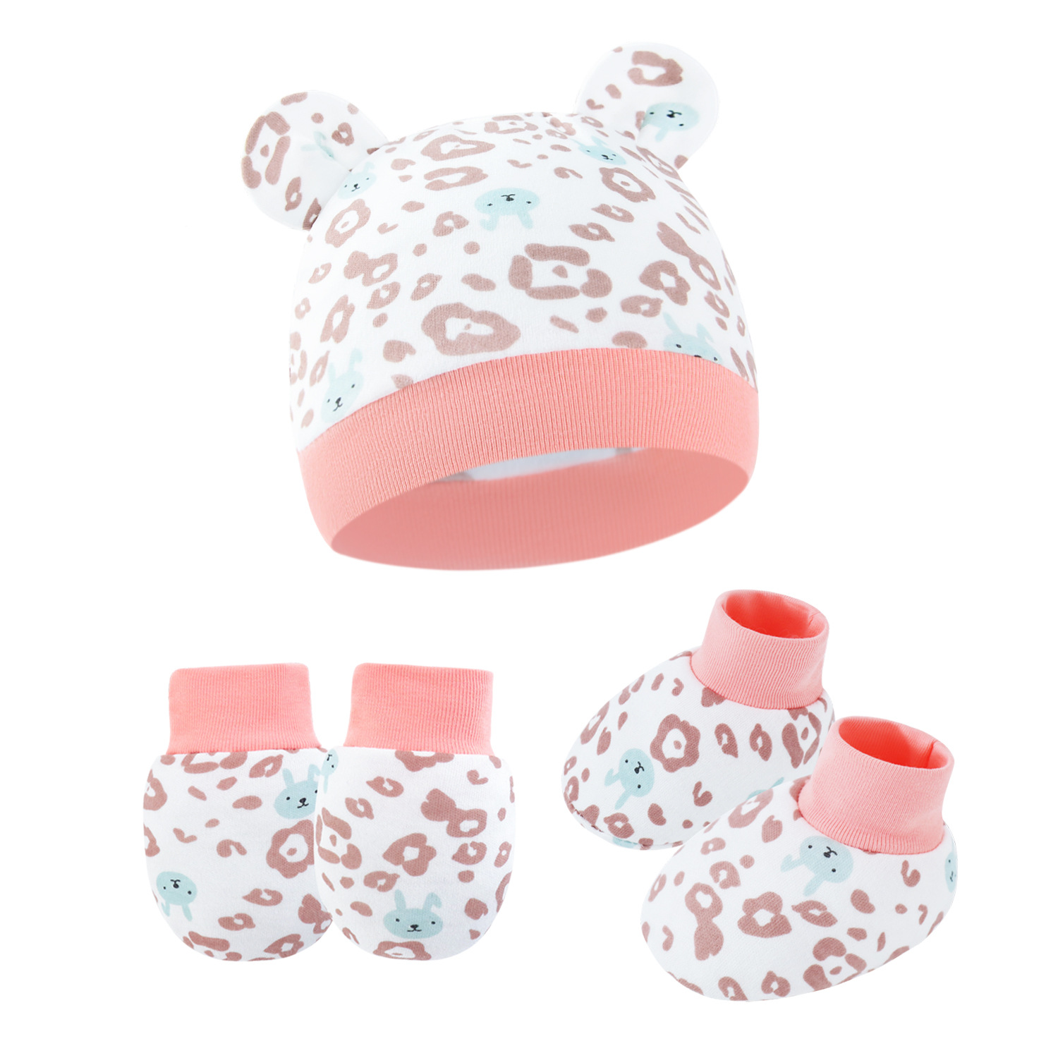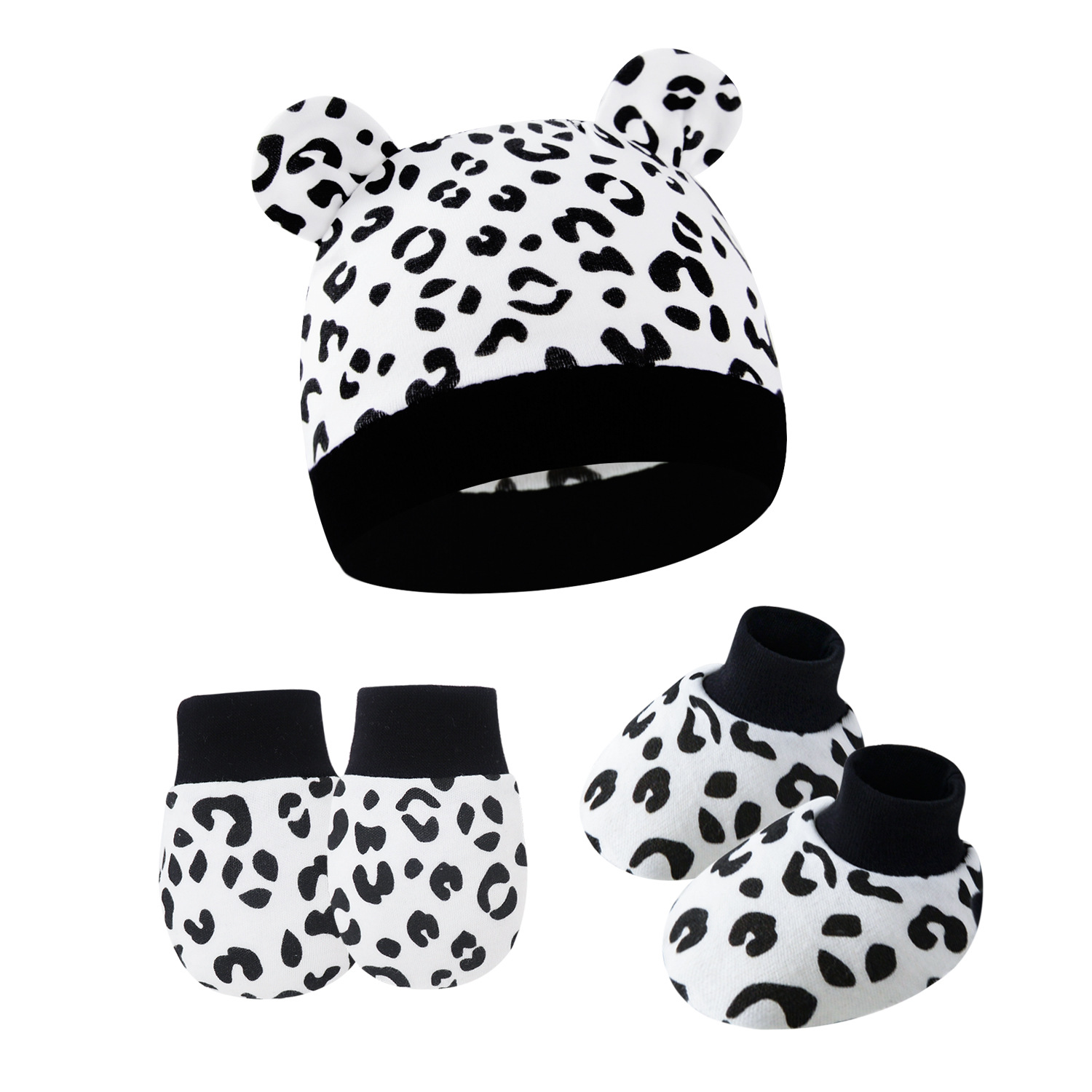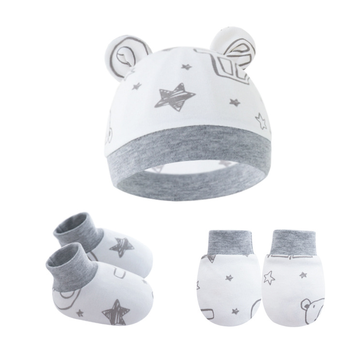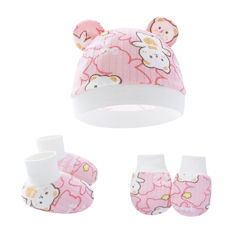 수출용 아기 모자, 아기 손발 보호장갑, 귀여운 곰돌이 모자, 신생아 귀달이 모자 (0-6개월)