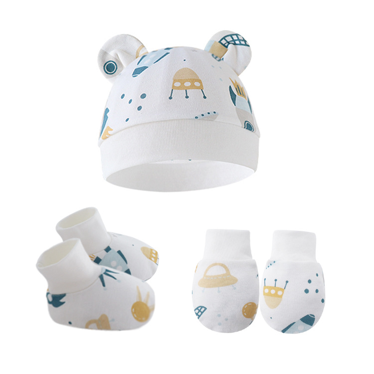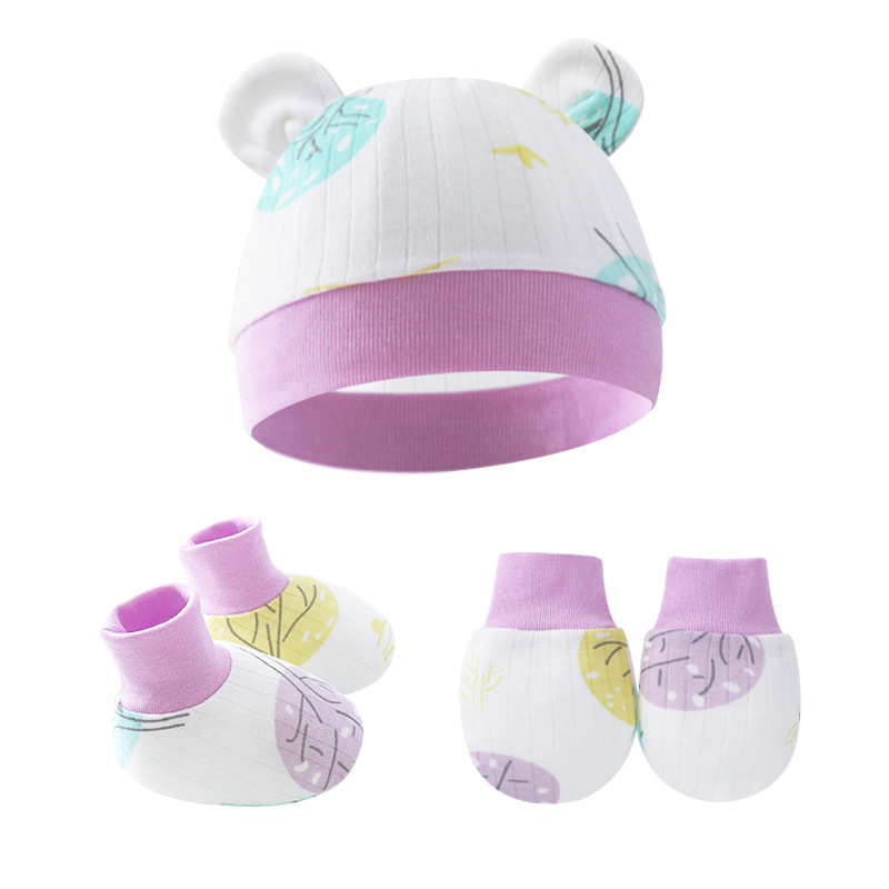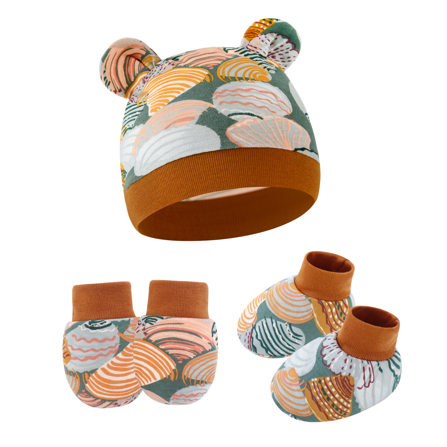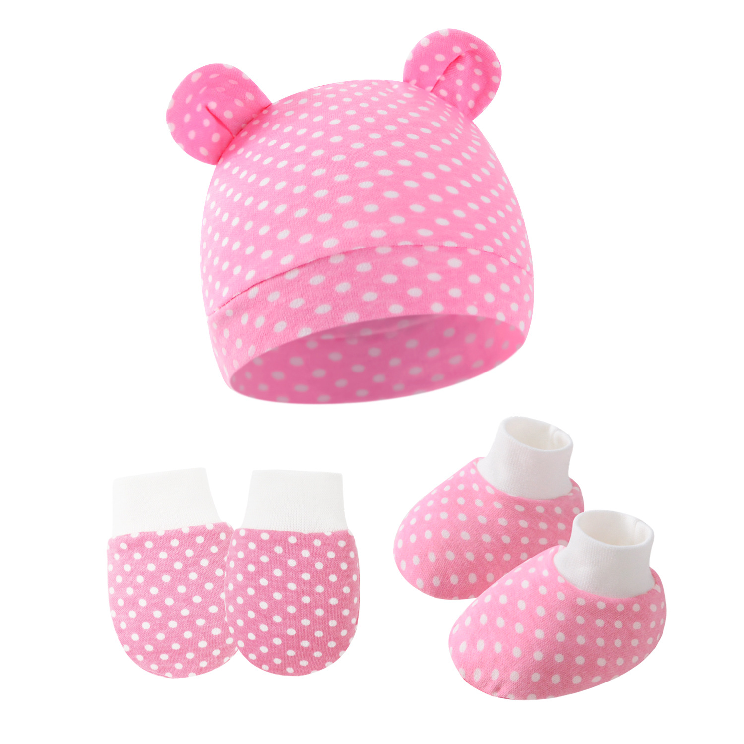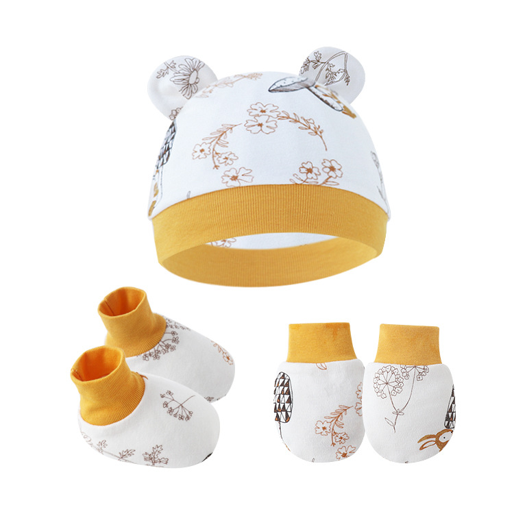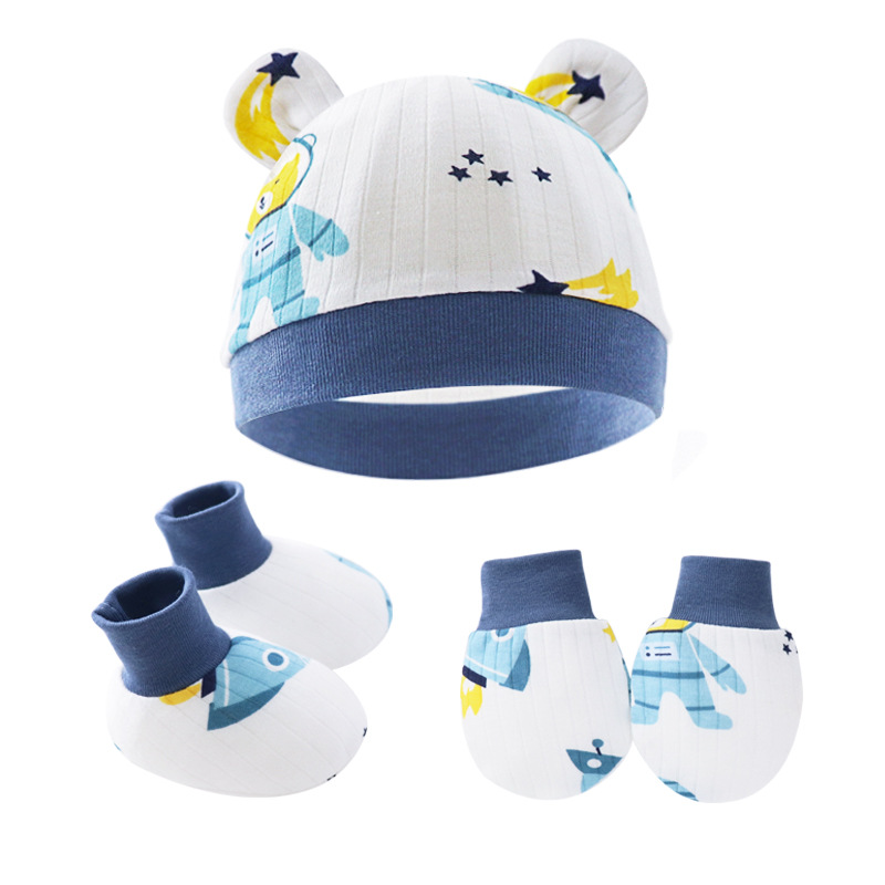 수출용 아기 모자, 아기 손발 보호장갑, 귀여운 곰돌이 모자, 신생아 귀달이 모자 (0-6개월)