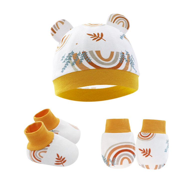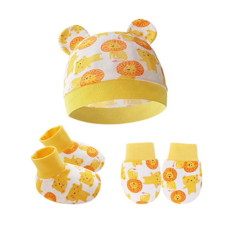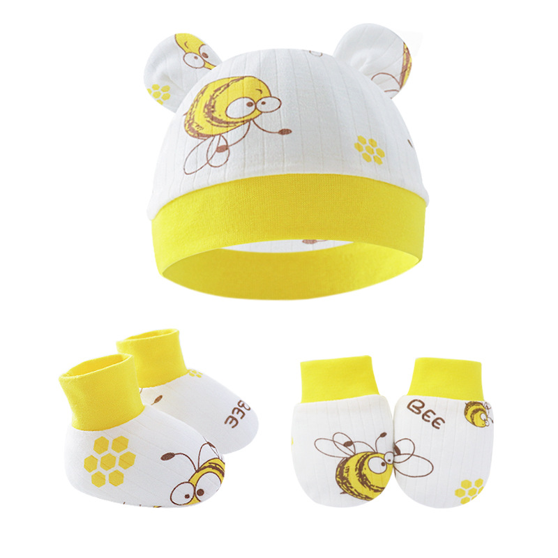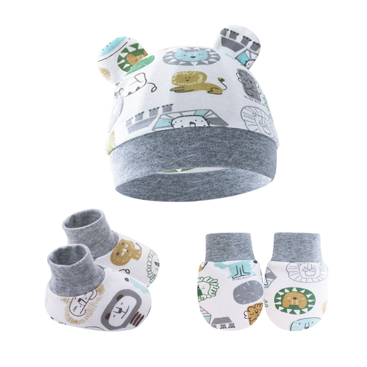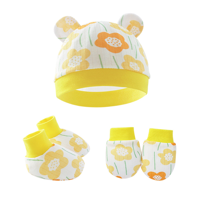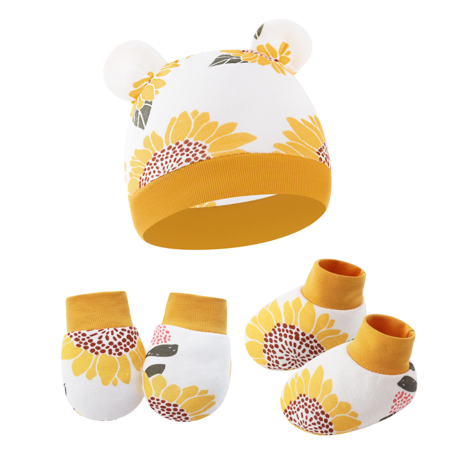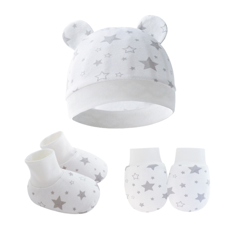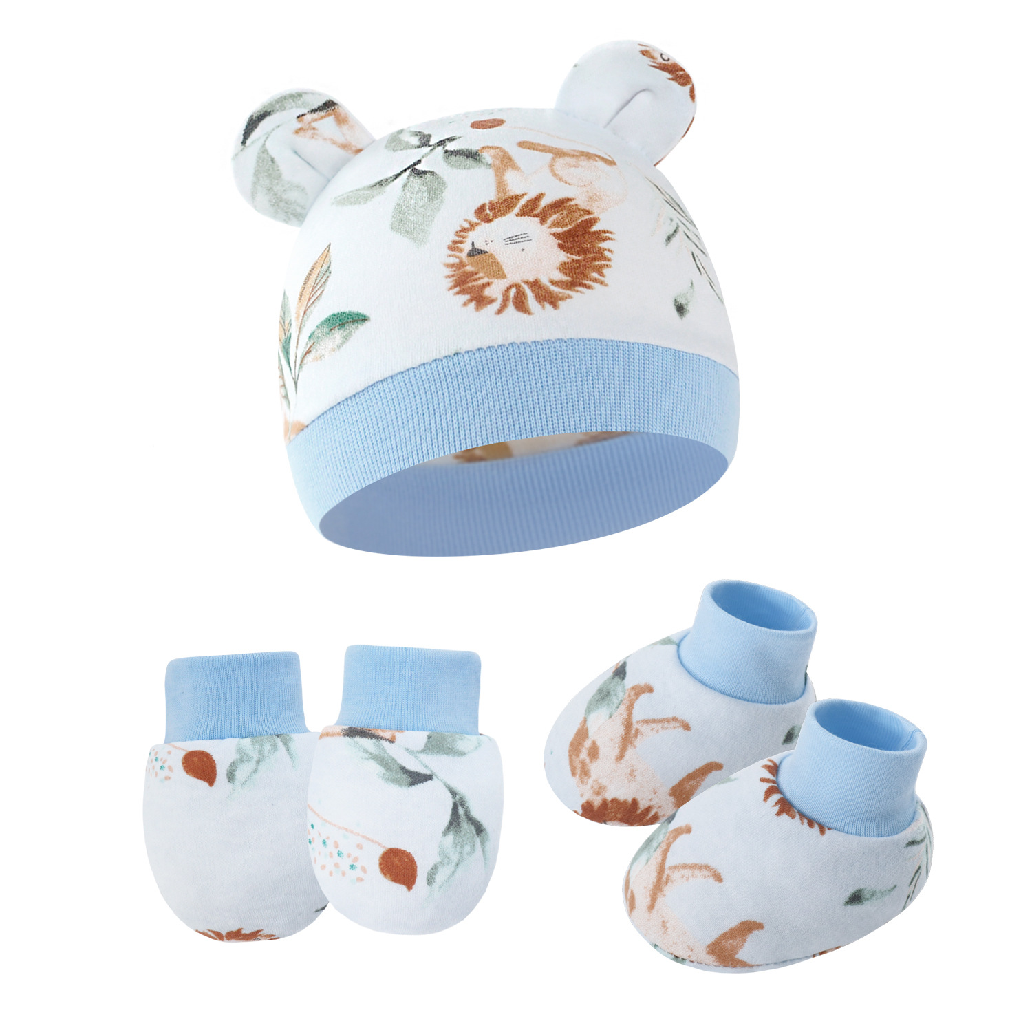 수출용 아기 모자, 아기 손발 보호장갑, 귀여운 곰돌이 모자, 신생아 귀달이 모자 (0-6개월)