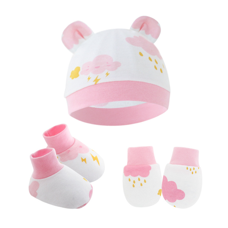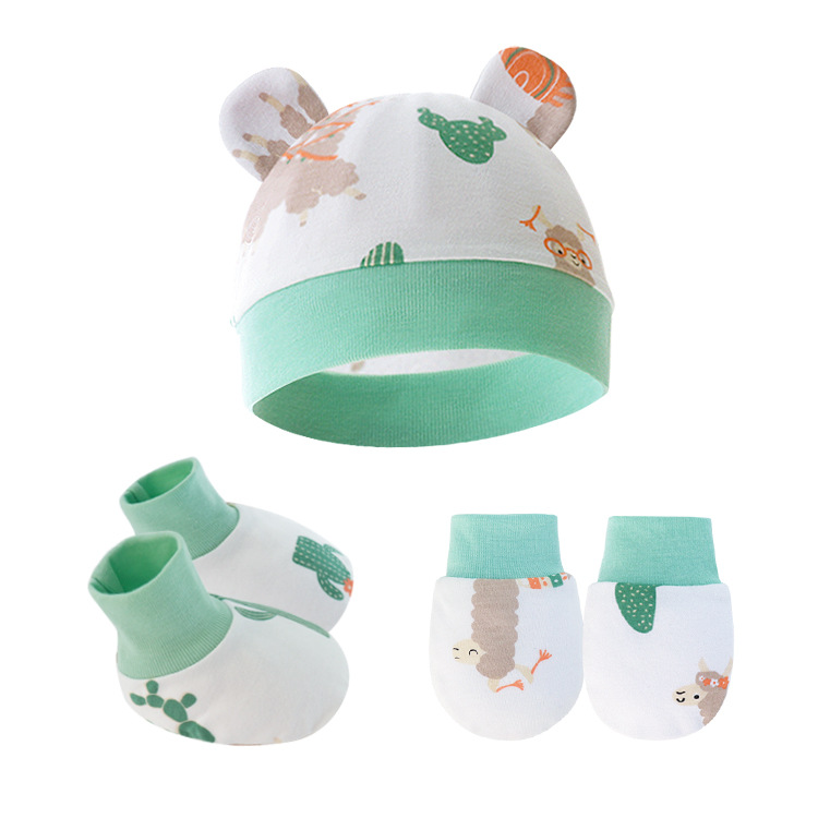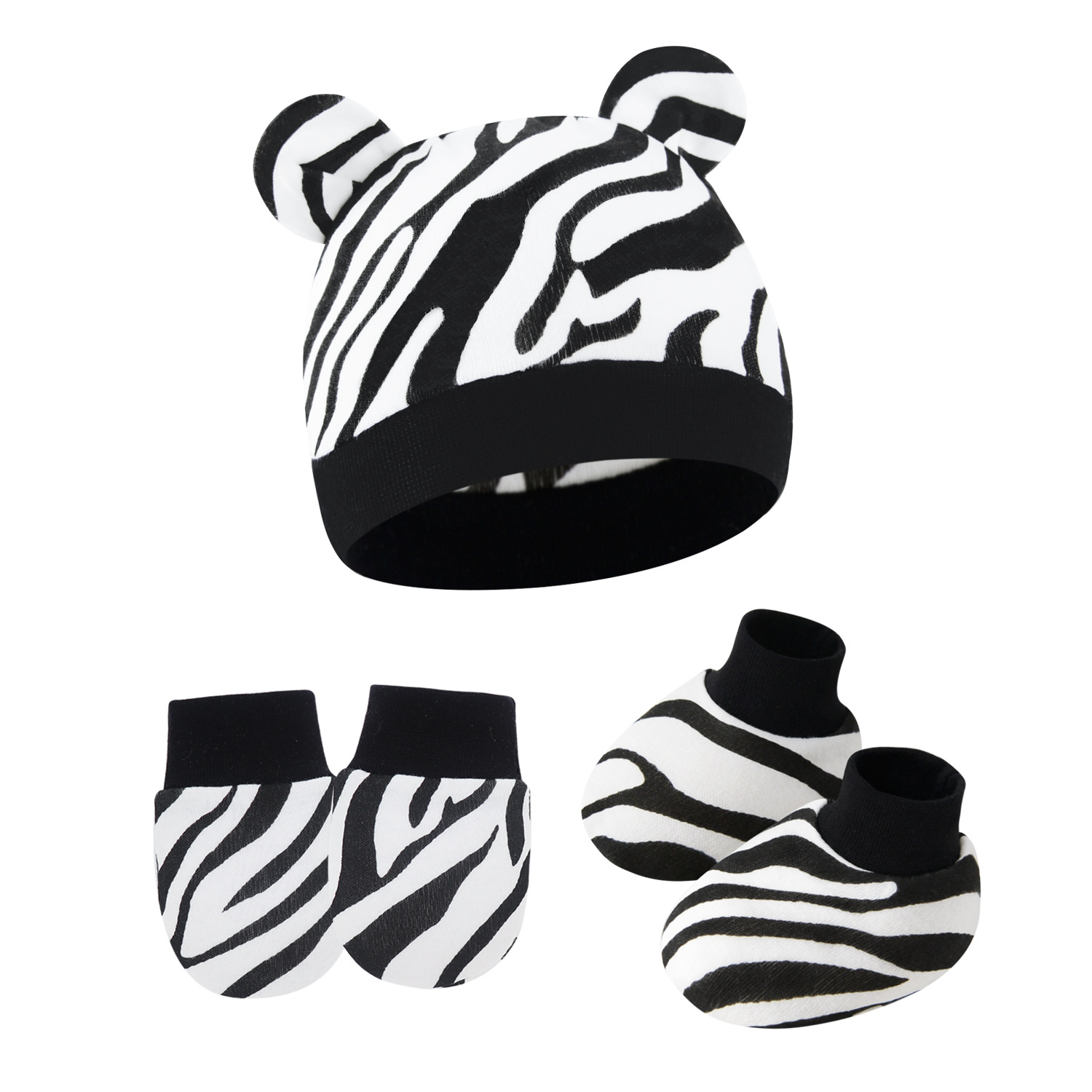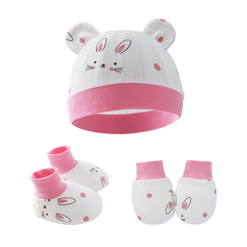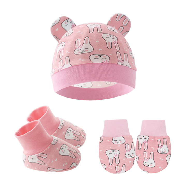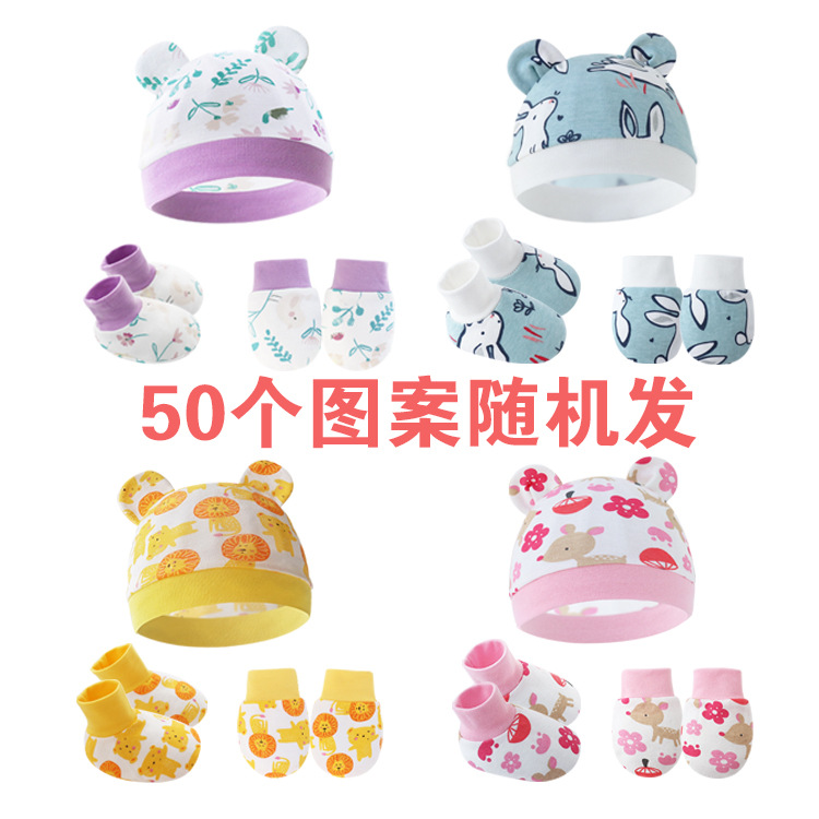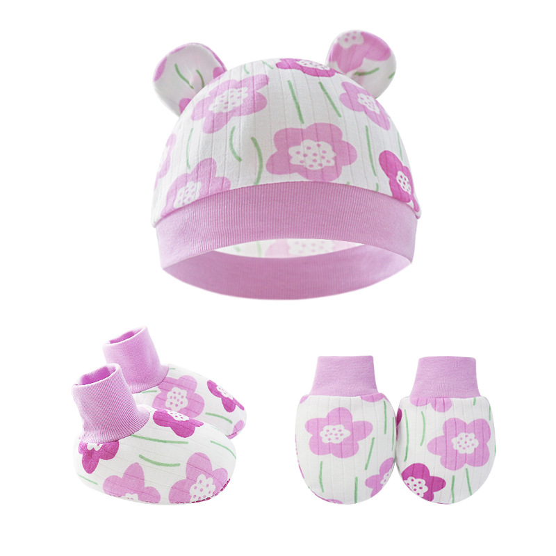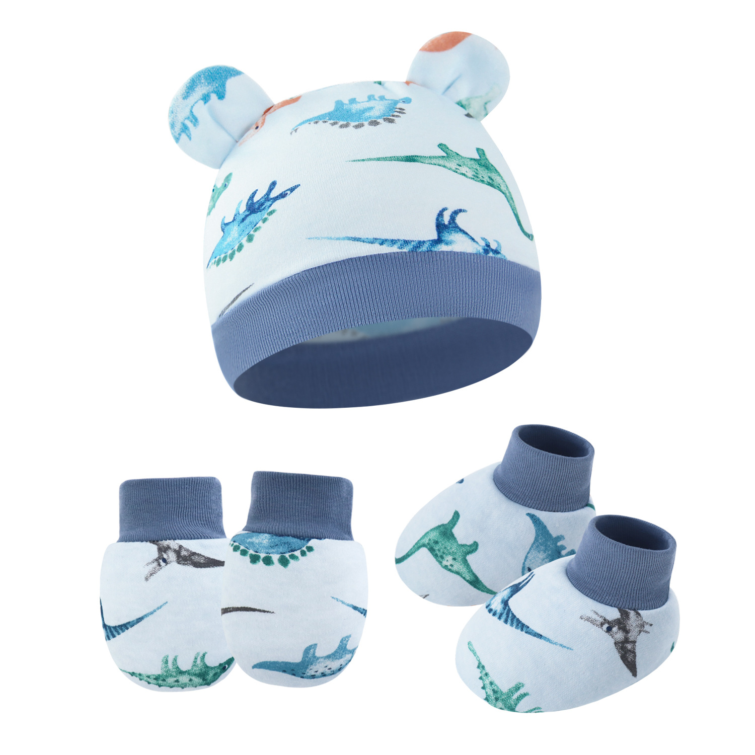 수출용 아기 모자, 아기 손발 보호장갑, 귀여운 곰돌이 모자, 신생아 귀달이 모자 (0-6개월)