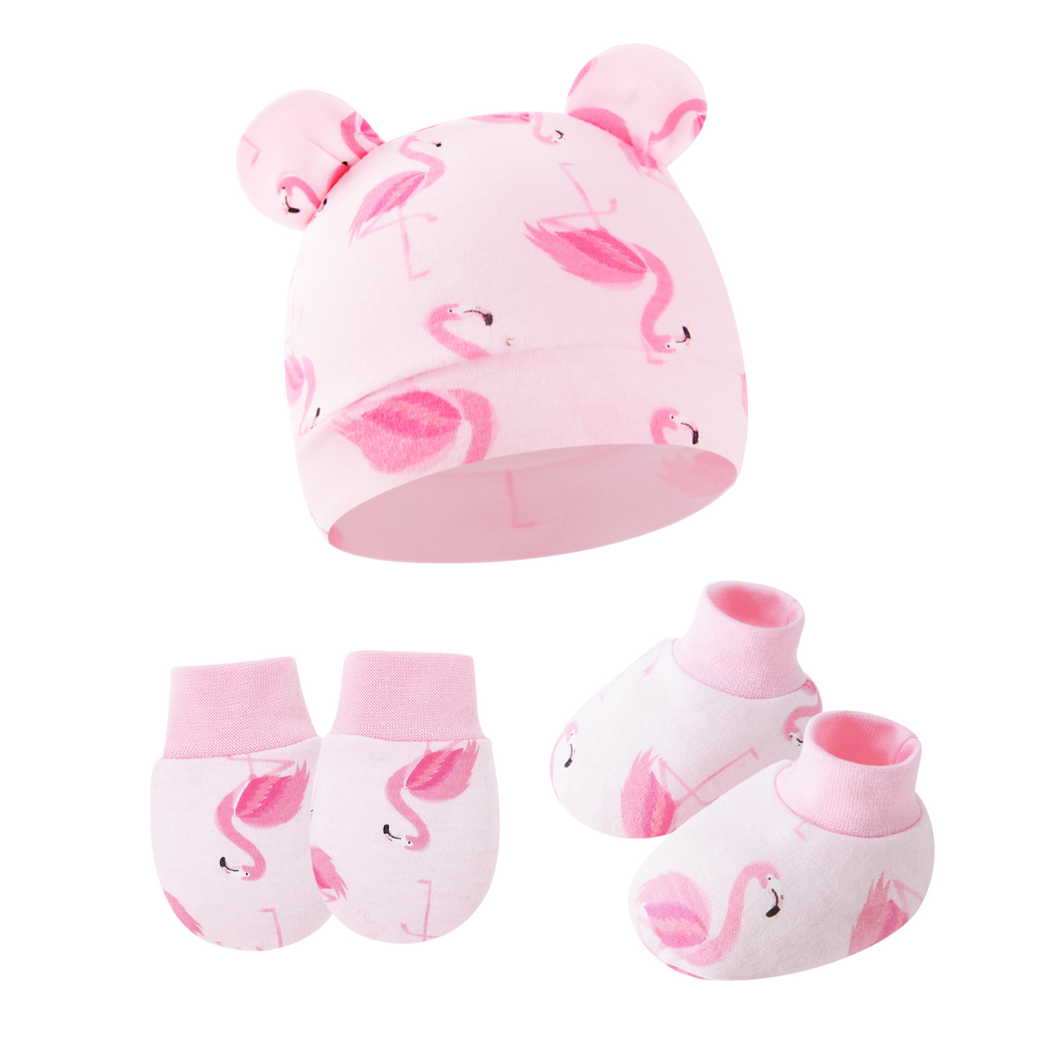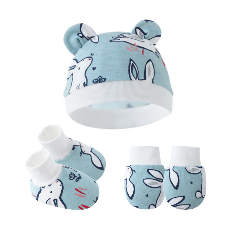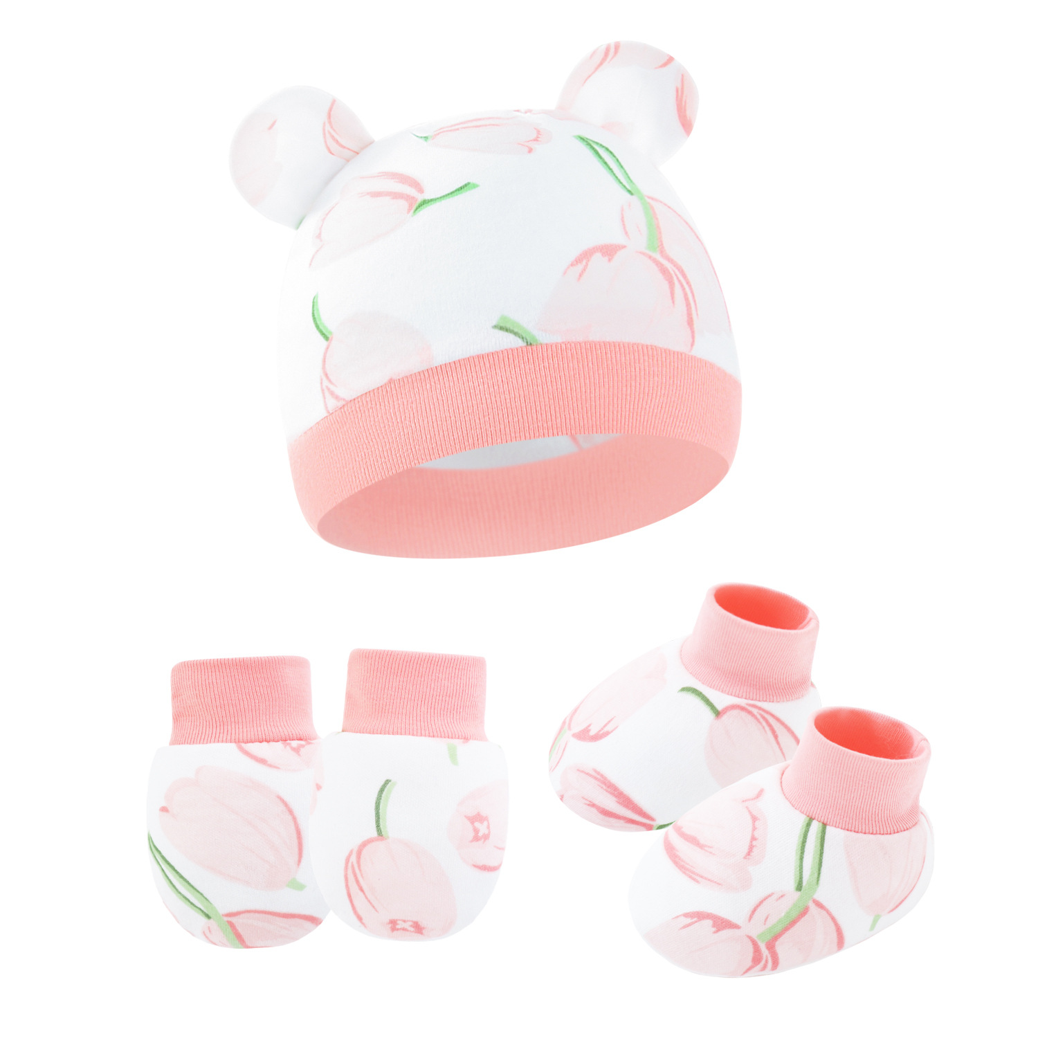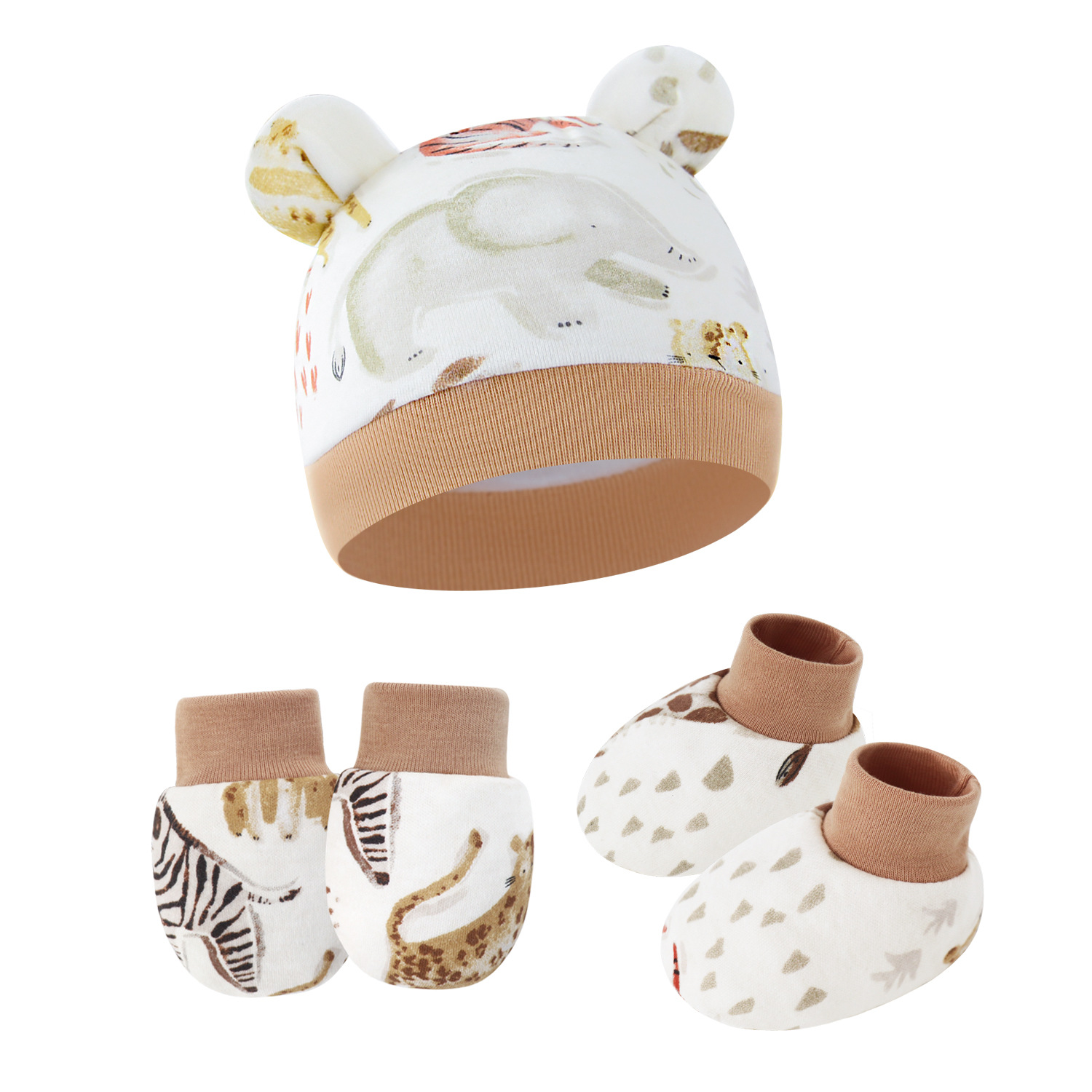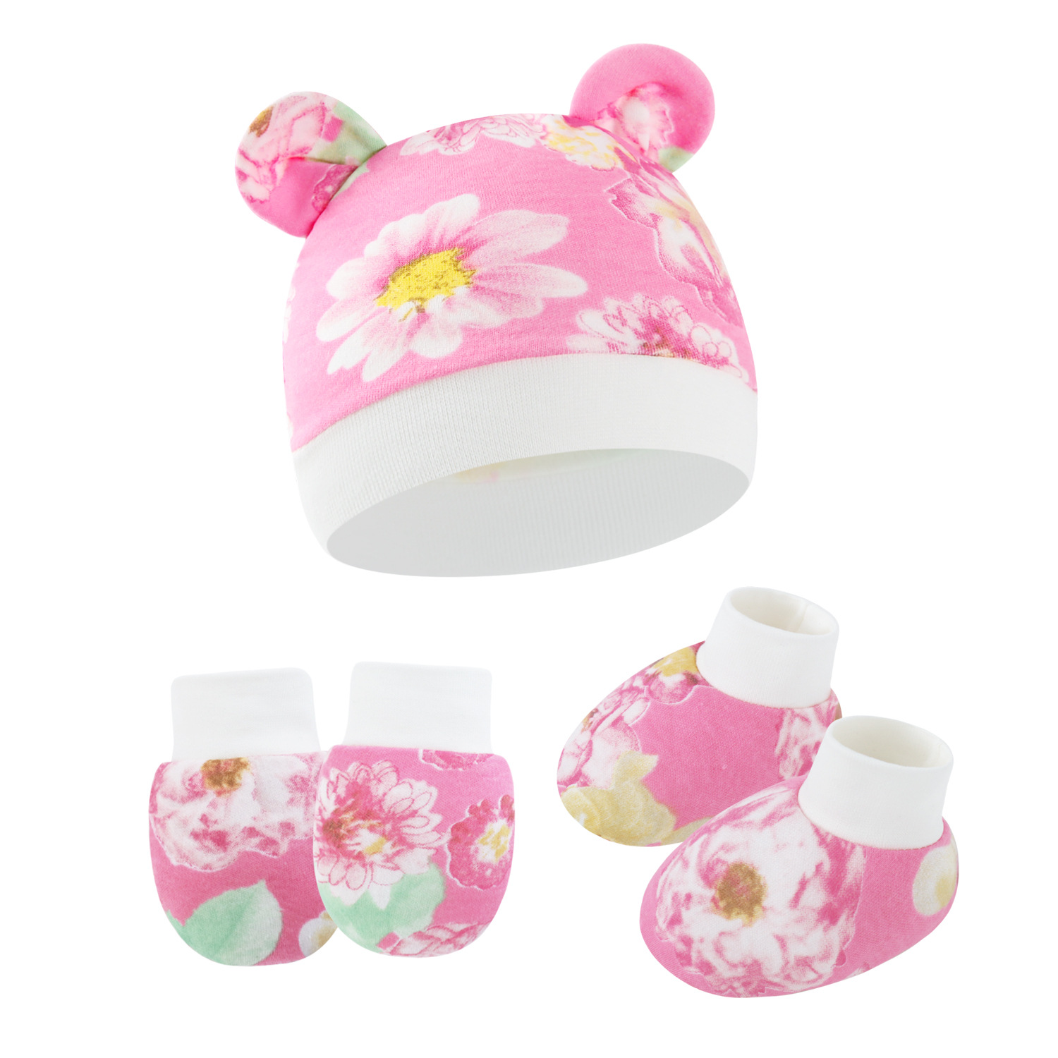 수출용 아기 모자, 아기 손발 보호장갑, 귀여운 곰돌이 모자, 신생아 귀달이 모자 (0-6개월)