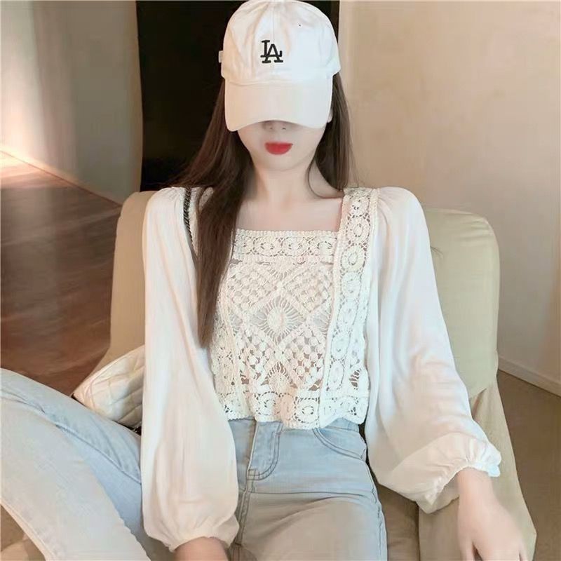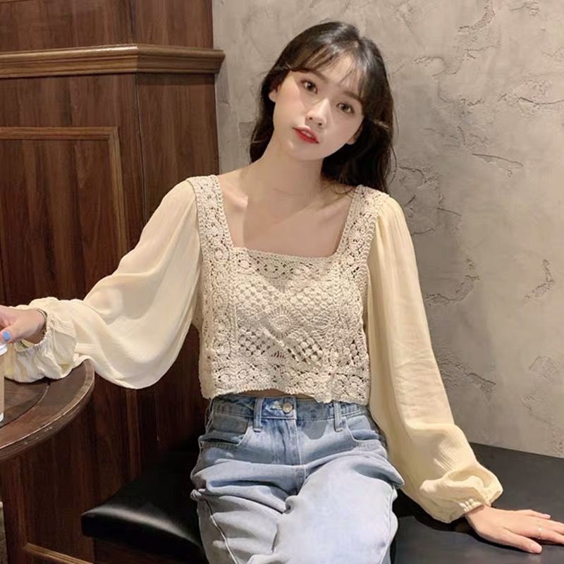 프랑스 스타일 쇄골 스퀘어 칼라 탑 여성의 디자인 센스 2022 새로운 봄 가을 한국 스타일 봄 가을 짧은 쉬폰 셔츠스토어 가기