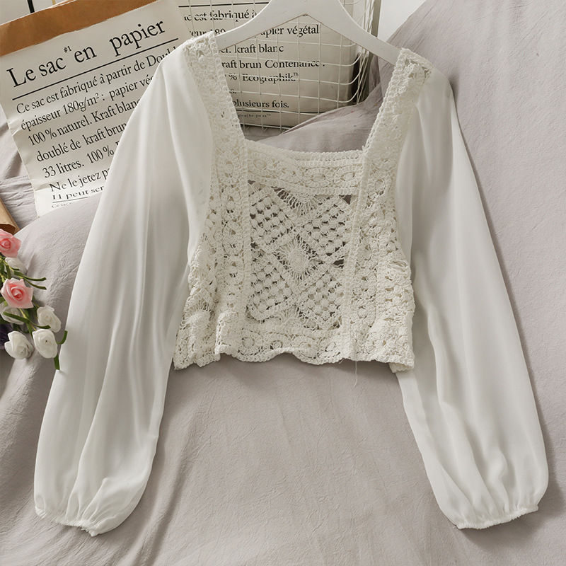프랑스 스타일 쇄골 스퀘어 칼라 탑 여성의 디자인 센스 2022 새로운 봄 가을 한국 스타일 봄 가을 짧은 쉬폰 셔츠