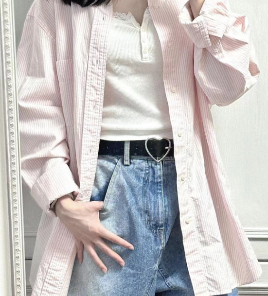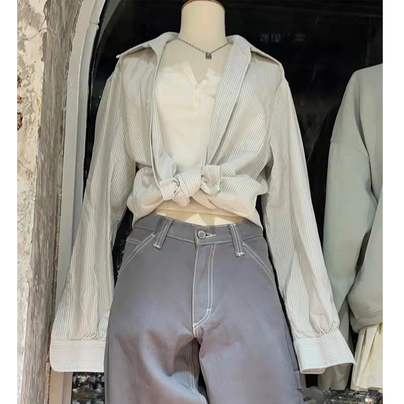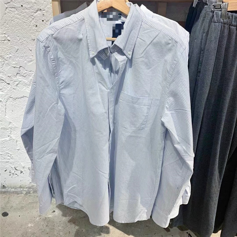 BM 스타일 블루 세로 줄무늬 긴 소매 셔츠 Bm 남자 친구 스타일 느슨한 캐주얼 옷깃 셔츠 캐주얼 겉옷 코트 패션스토어 가기
