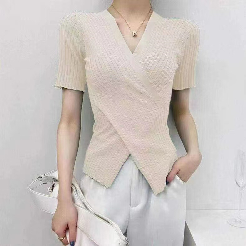 2036 # 이샤오한국판 불규칙 크로스 니트 반팔 여성 여름 베이스 레이어 V넥 솔리드 컬러 탑 티셔츠 여성용