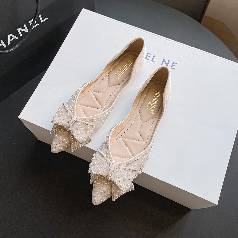 한국 스타일 봄 2023 새로운 부드러운 밑창 플랫 솔 패셔너블한 모든 경기 여성 신발 라인 석 나비 뾰족한 싱글 레이어 신발 플러스 사이즈