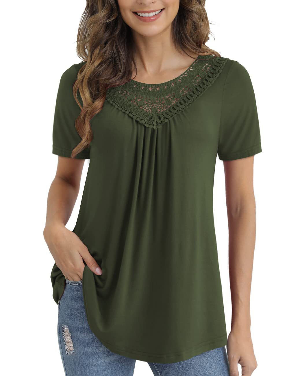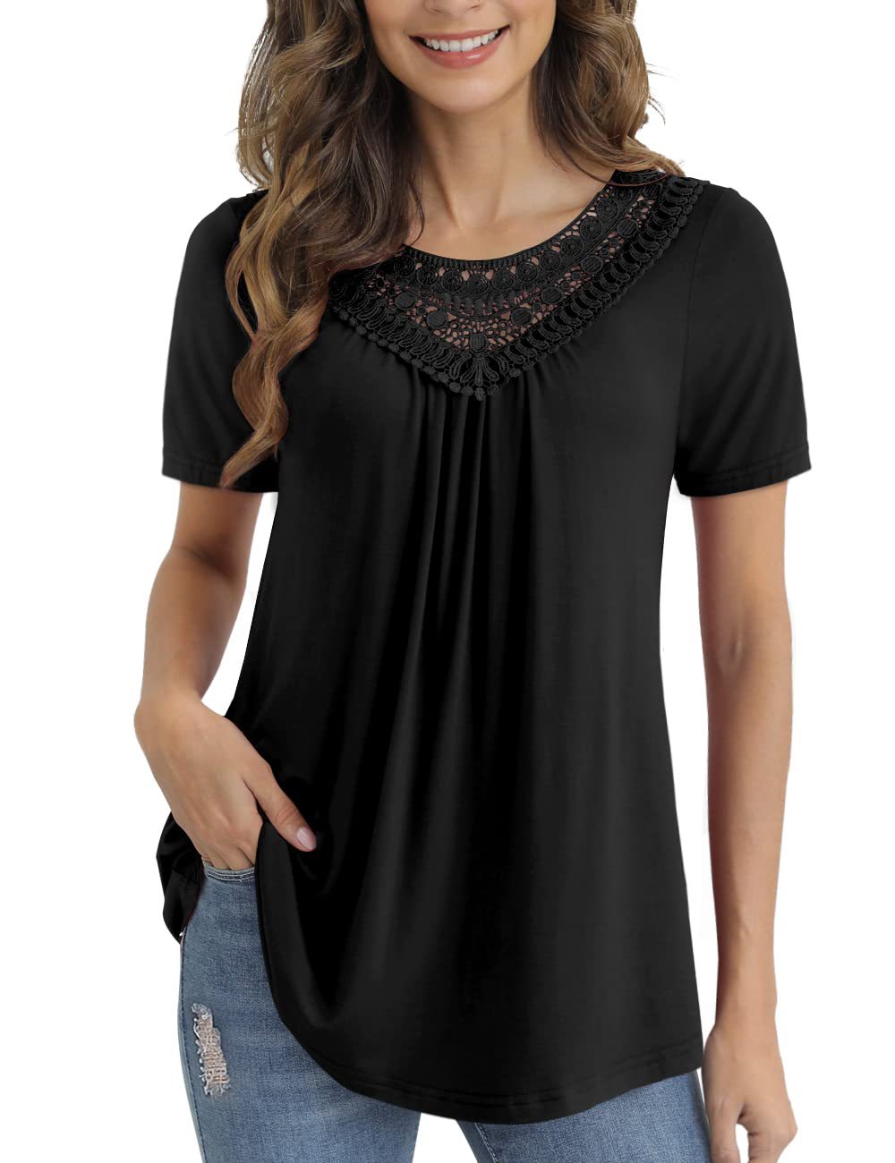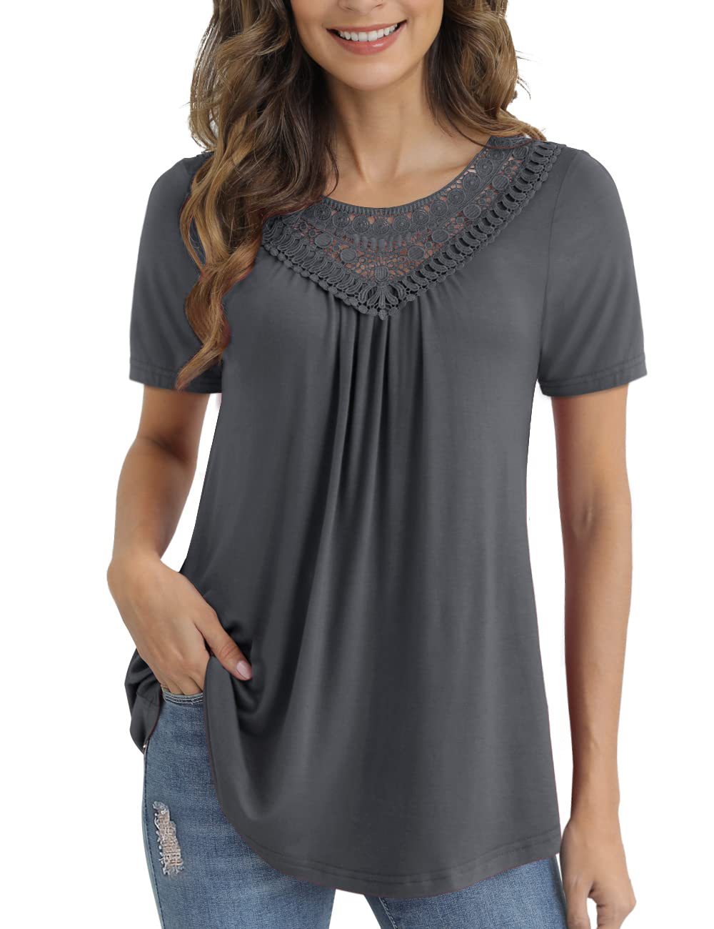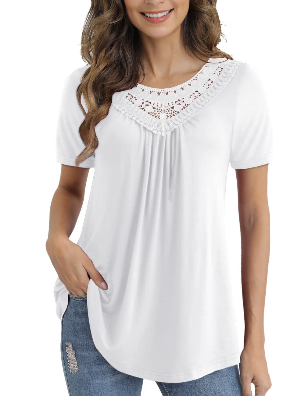 아마존 크로스 보더 여성 플러스 사이즈 여름 탑 짧은 소매 레이스 주름 셔츠 벨트 최고 M-4XL스토어 가기