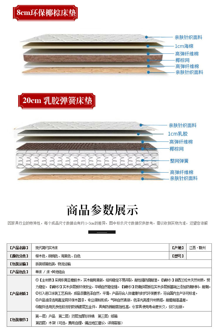 • [두꺼운 모델] 원목 침대 + 침대 옆 테이블 * 2 + 20 스프링 코코넛 야자 매트리스