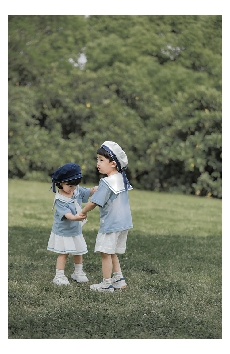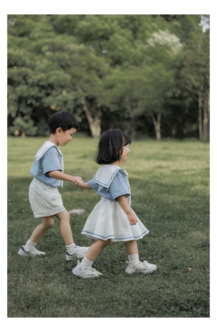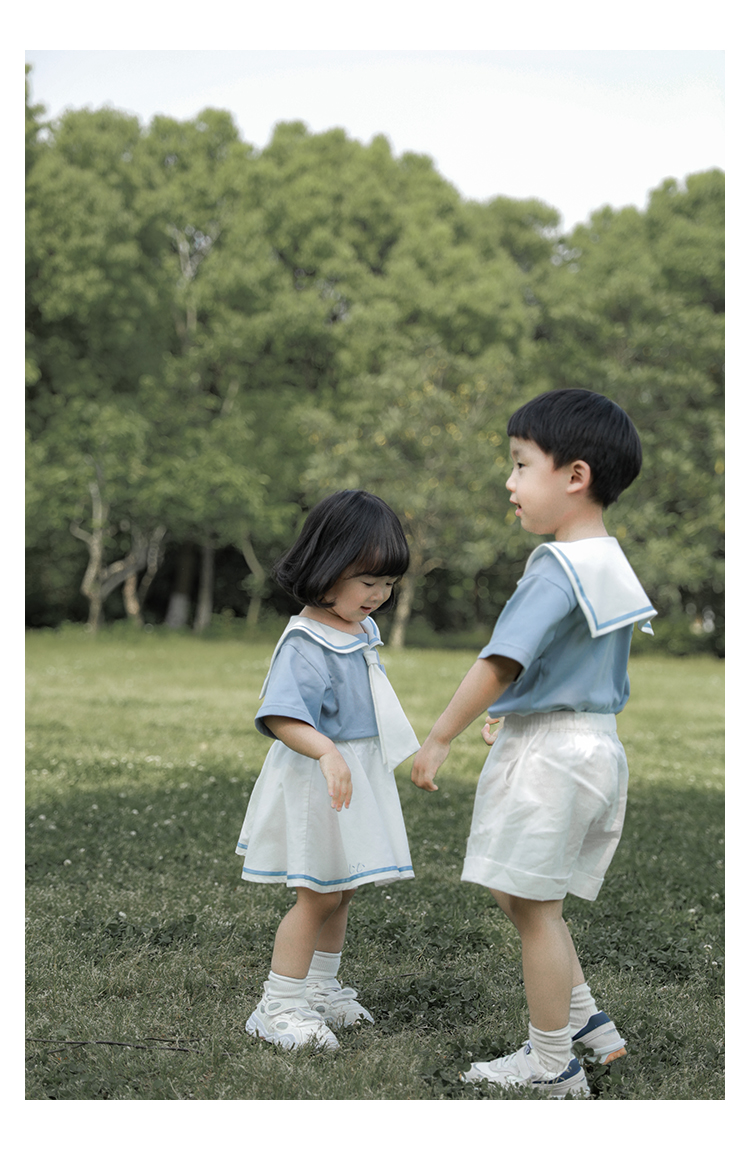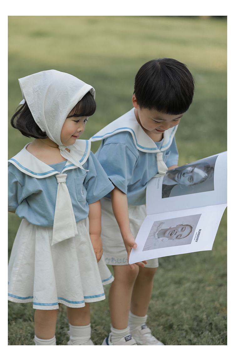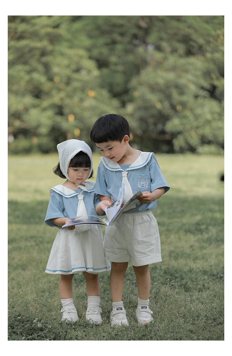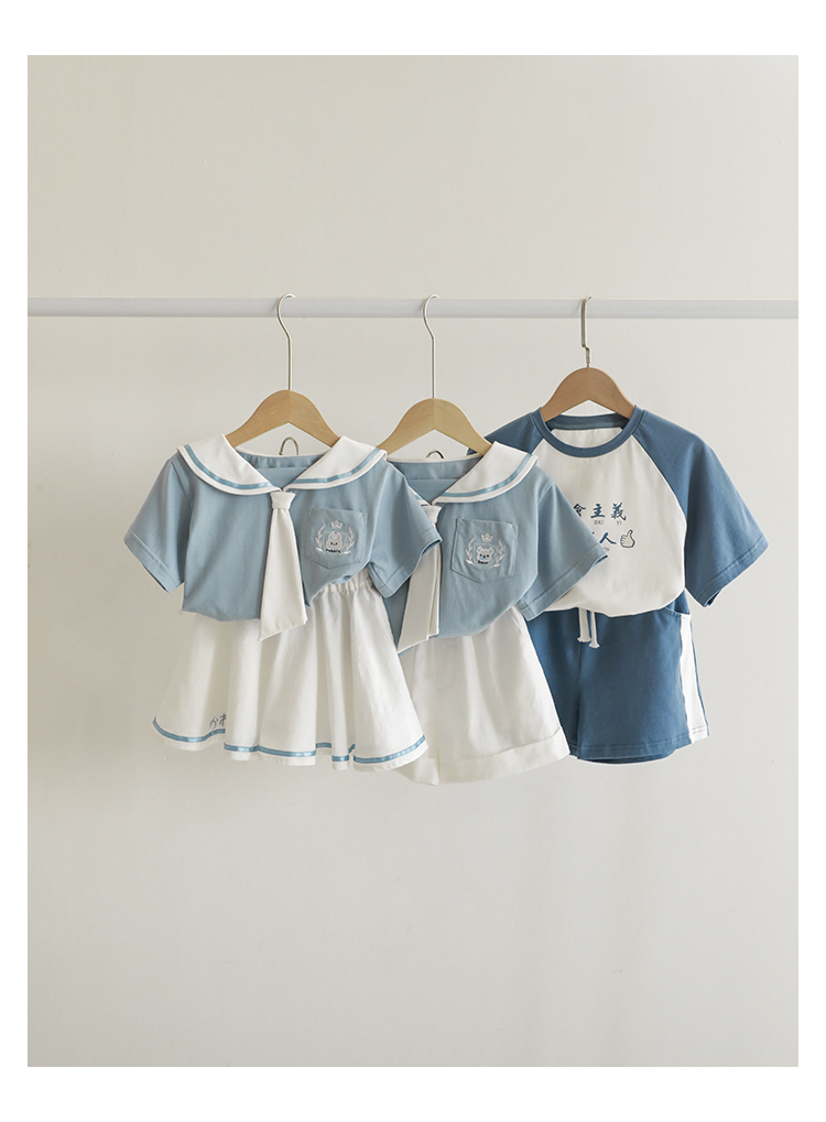 내 갈비뼈 형제와 자매 원피스 아카데미 스타일 세트 소년의 승무원 칼라 반팔 티셔츠 바지 아기 소녀 얇은 치마스토어 가기