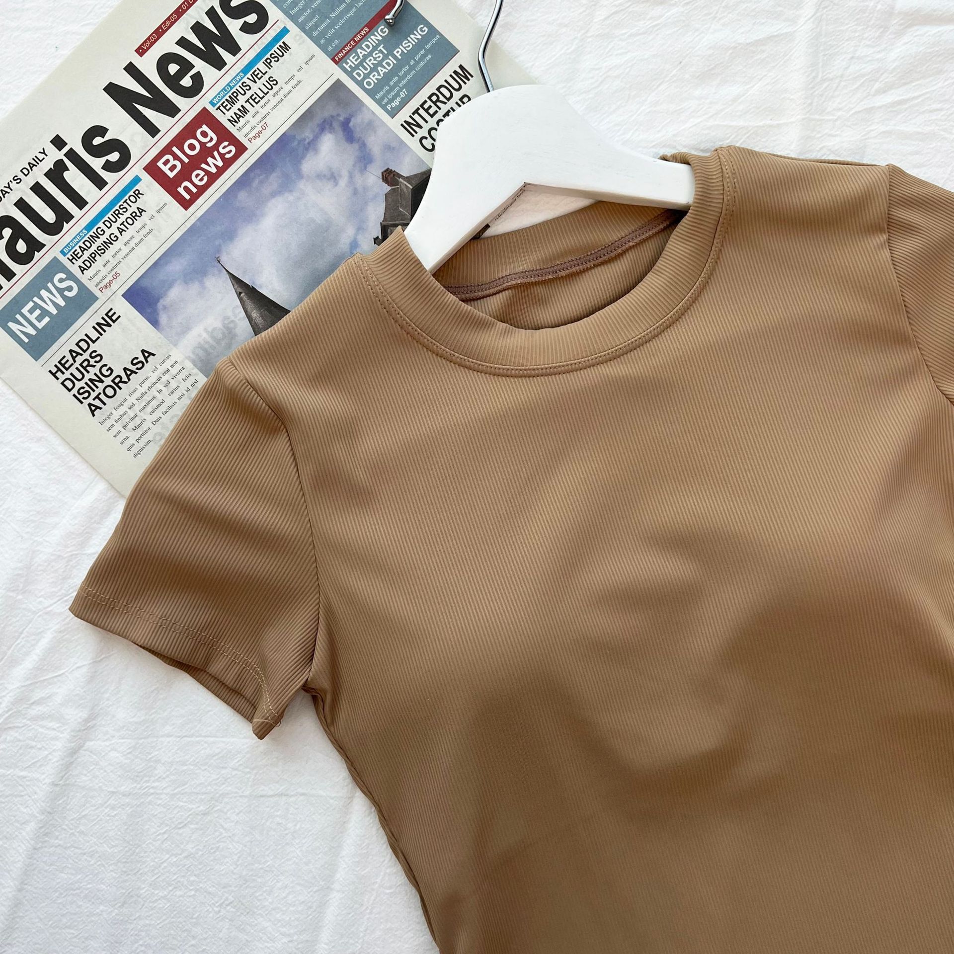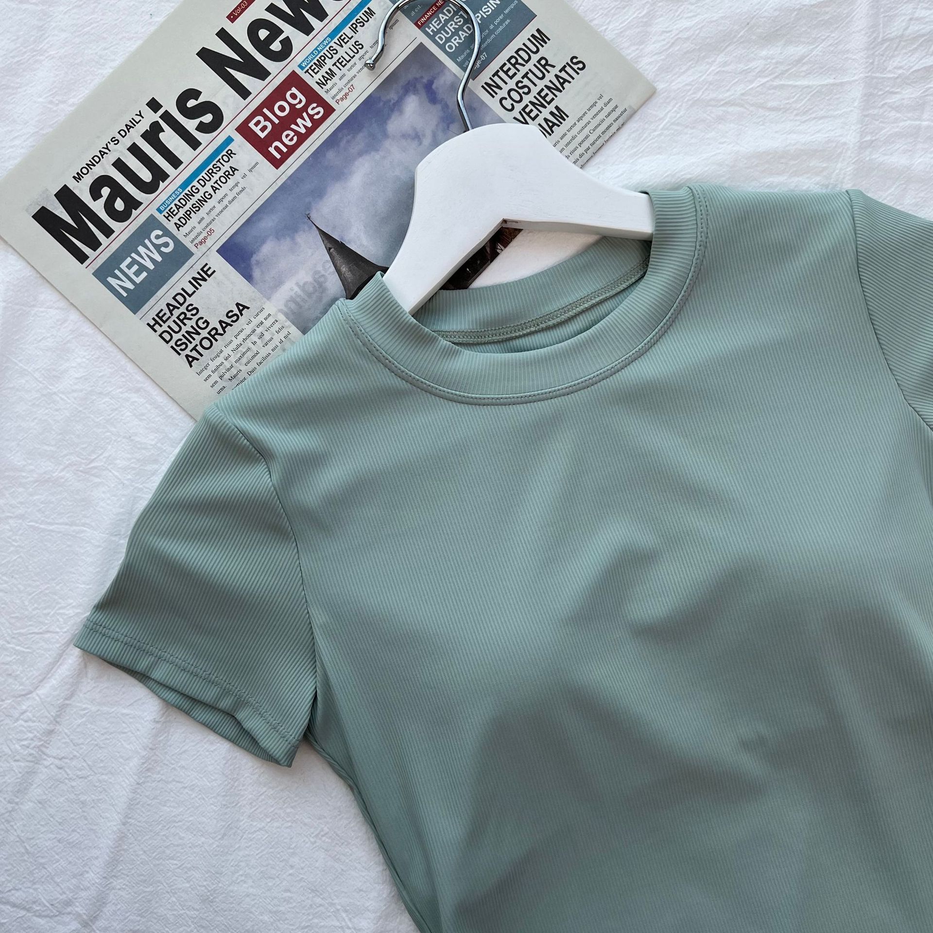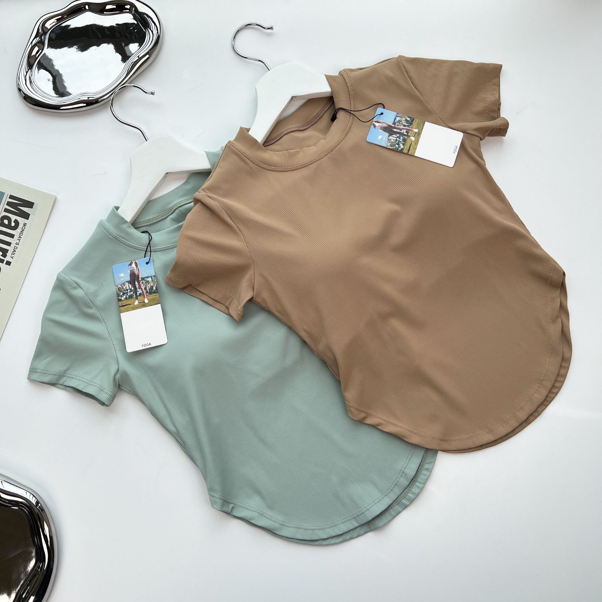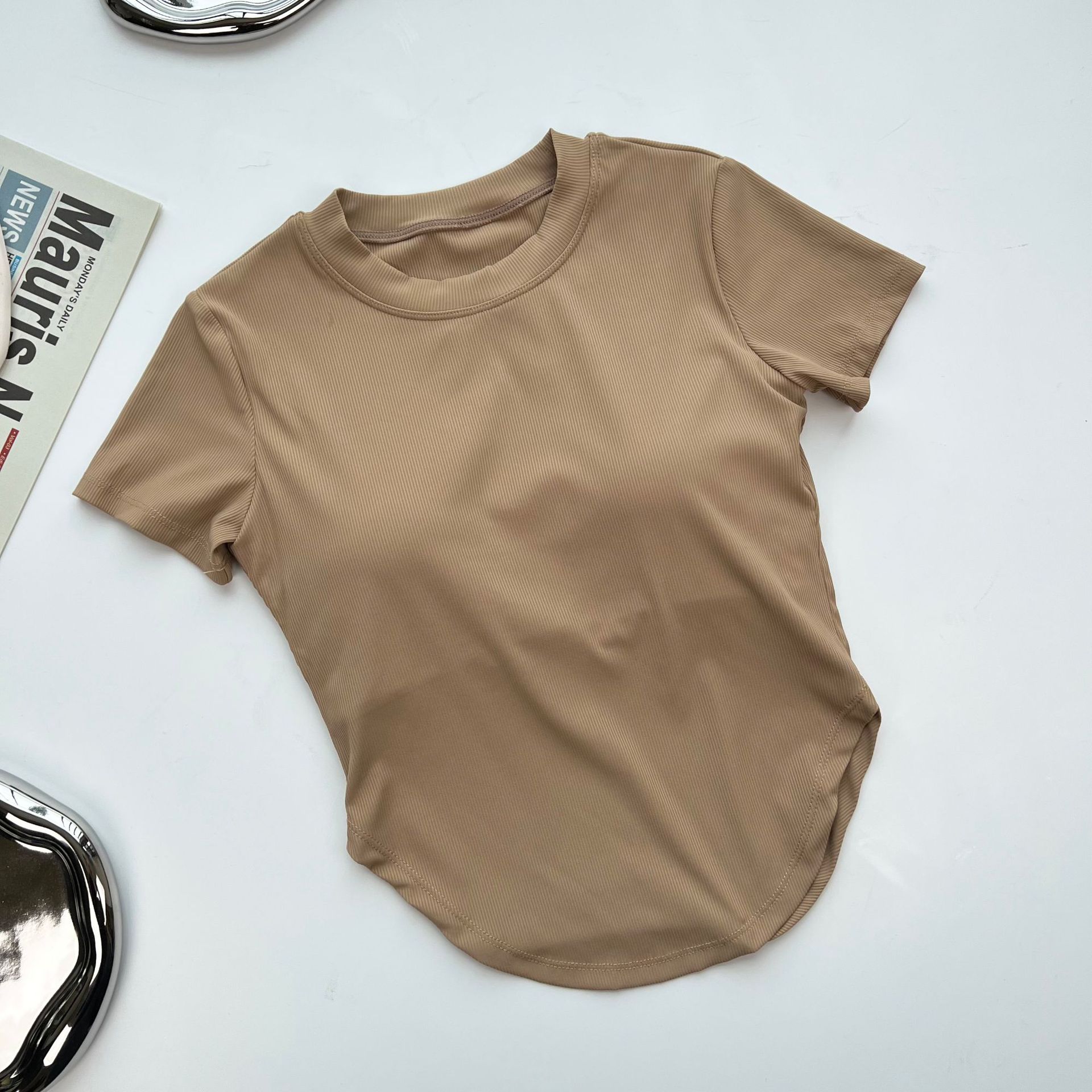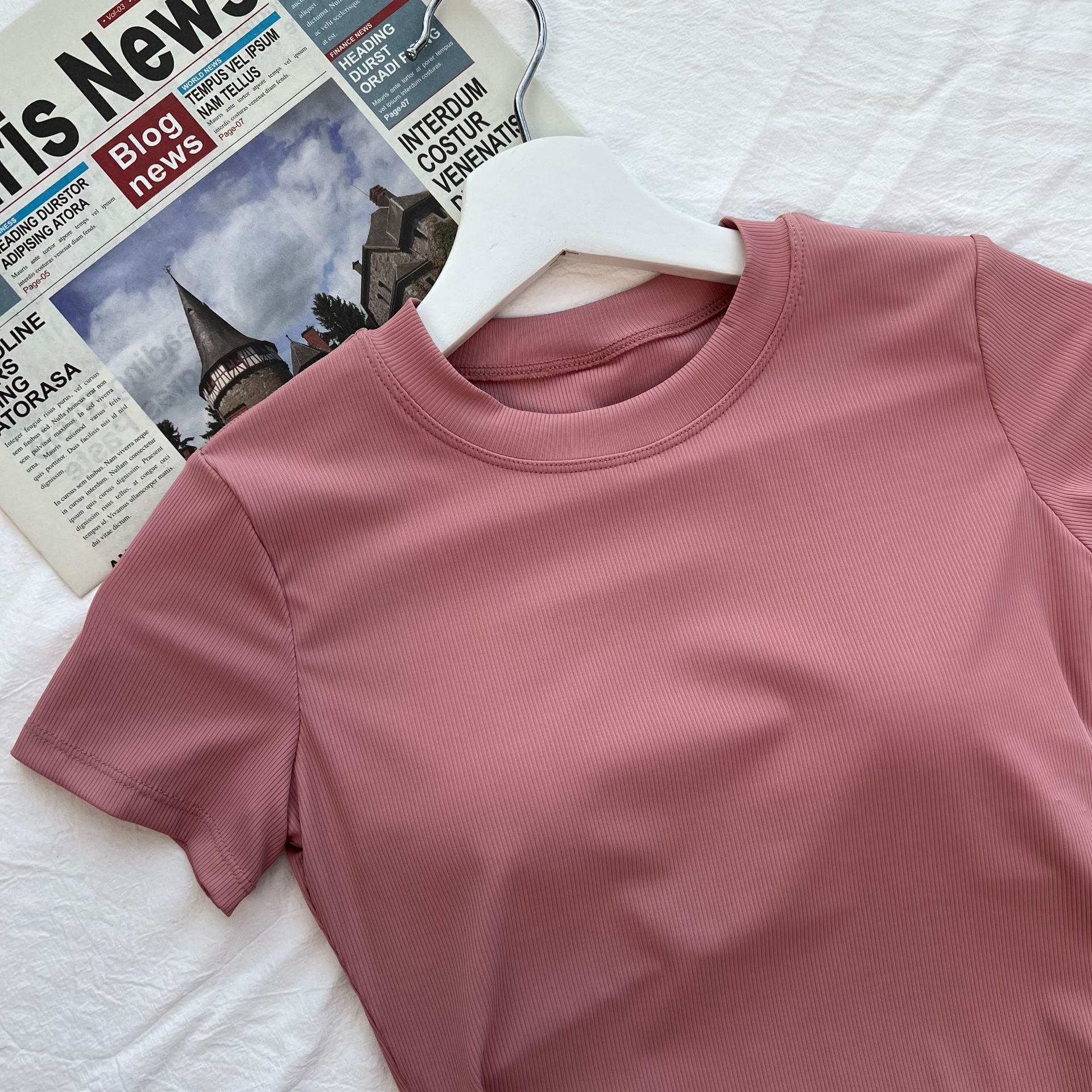 시원한 반팔 요가복, 가슴 패드 내장, 부드러운 누드감, 허리 노출 스포츠 탑, 슬림핏 피트니스 티셔츠, 초탄력스토어 가기