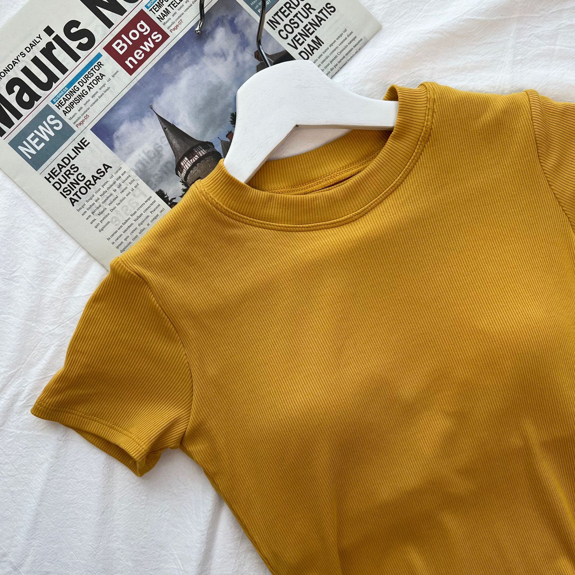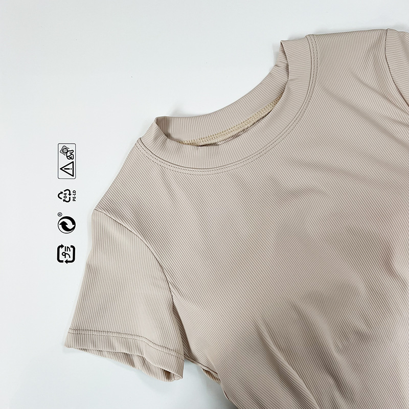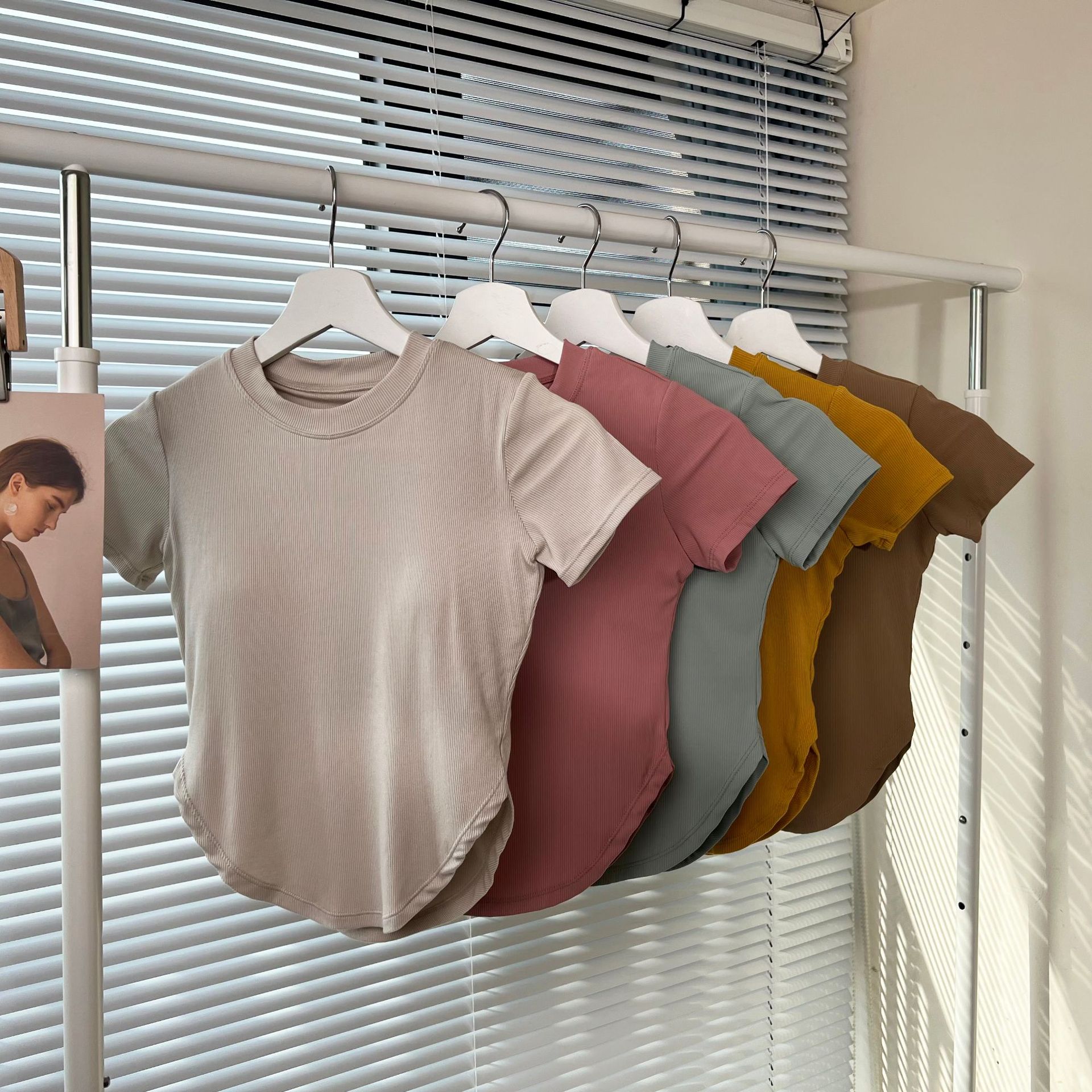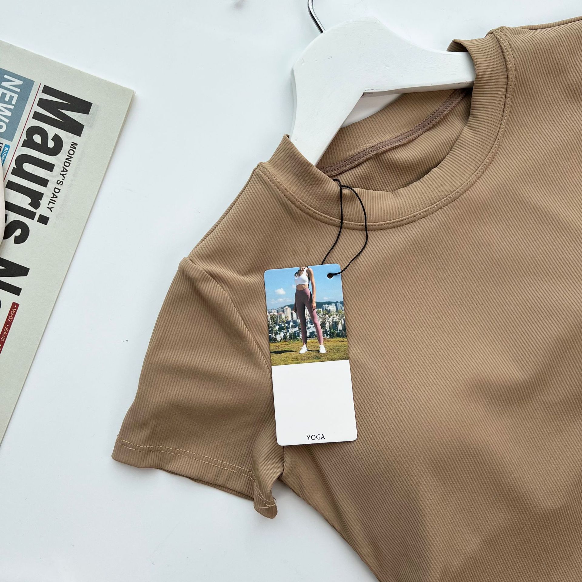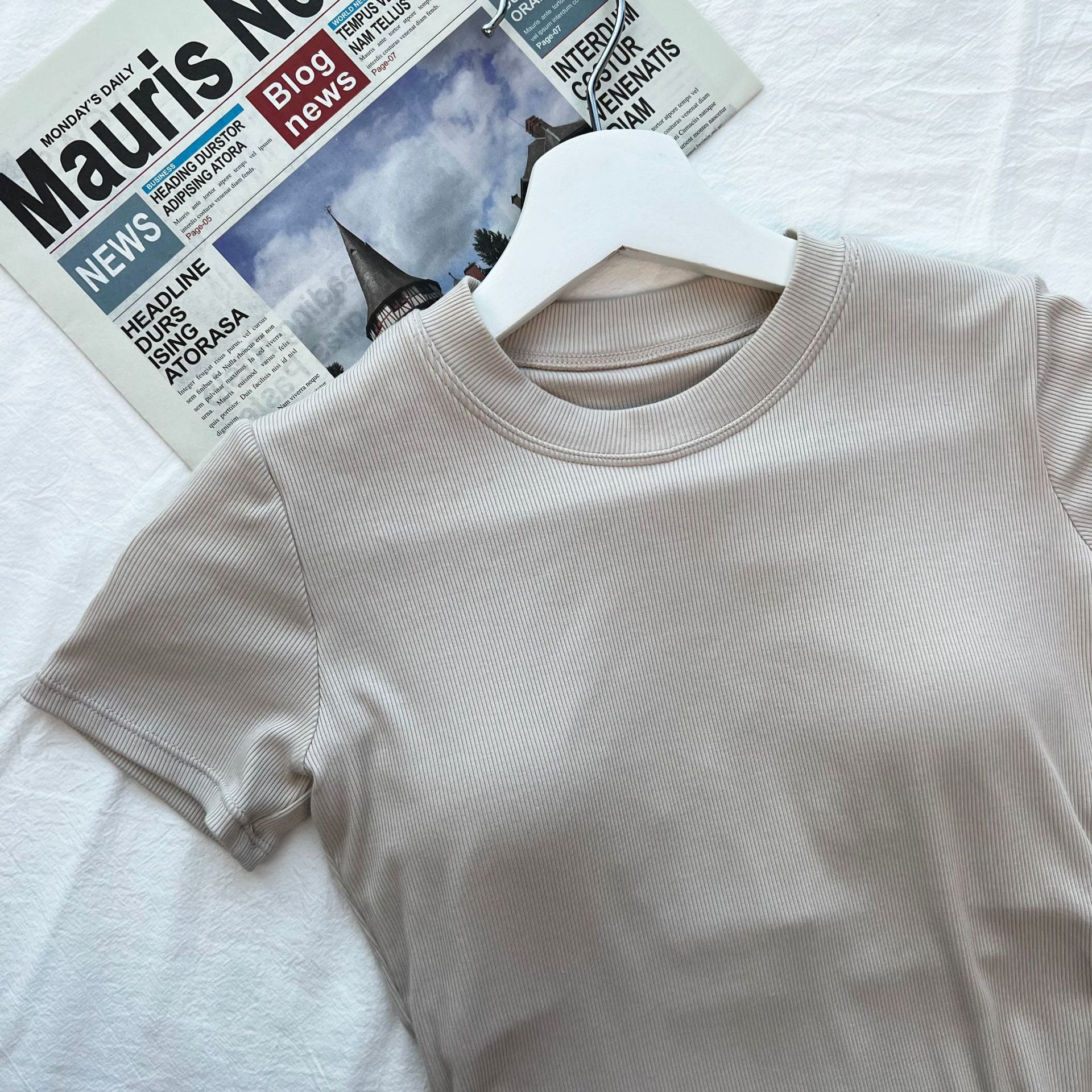 시원한 반팔 요가복, 가슴 패드 내장, 부드러운 누드감, 허리 노출 스포츠 탑, 슬림핏 피트니스 티셔츠, 초탄력스토어 가기