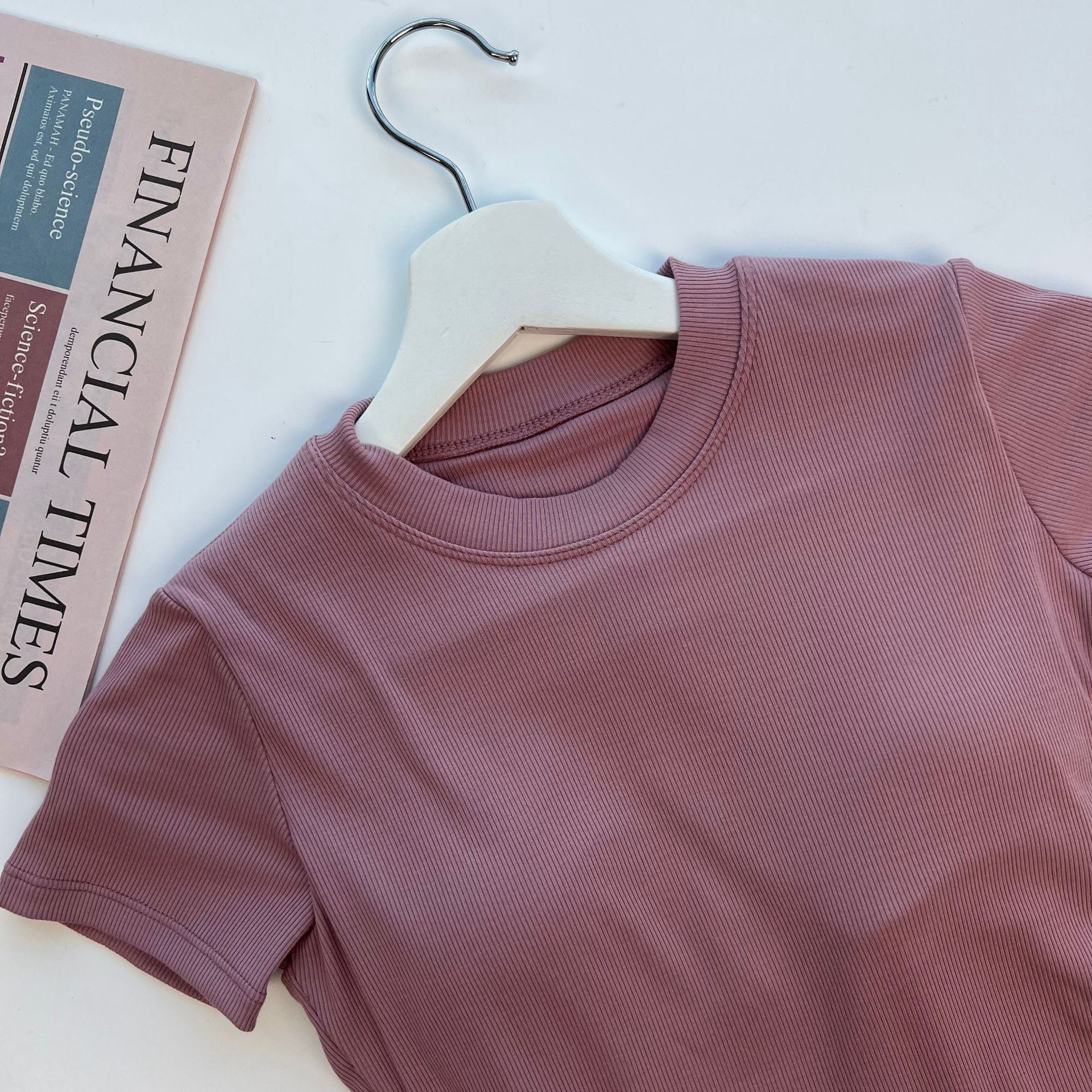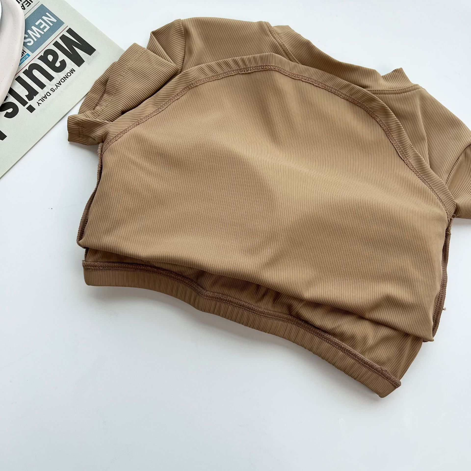 시원한 반팔 요가복, 가슴 패드 내장, 부드러운 누드감, 허리 노출 스포츠 탑, 슬림핏 피트니스 티셔츠, 초탄력