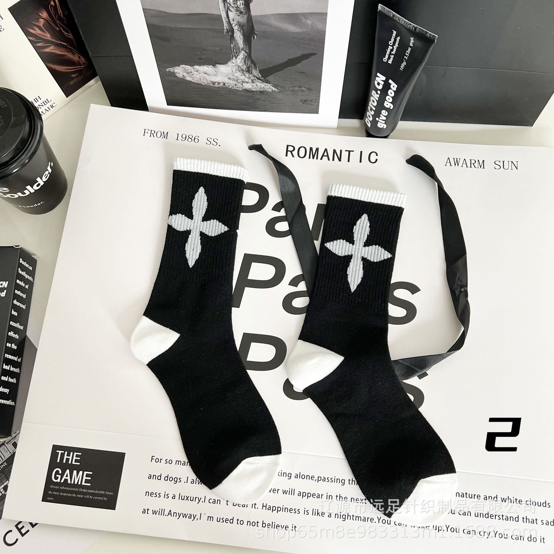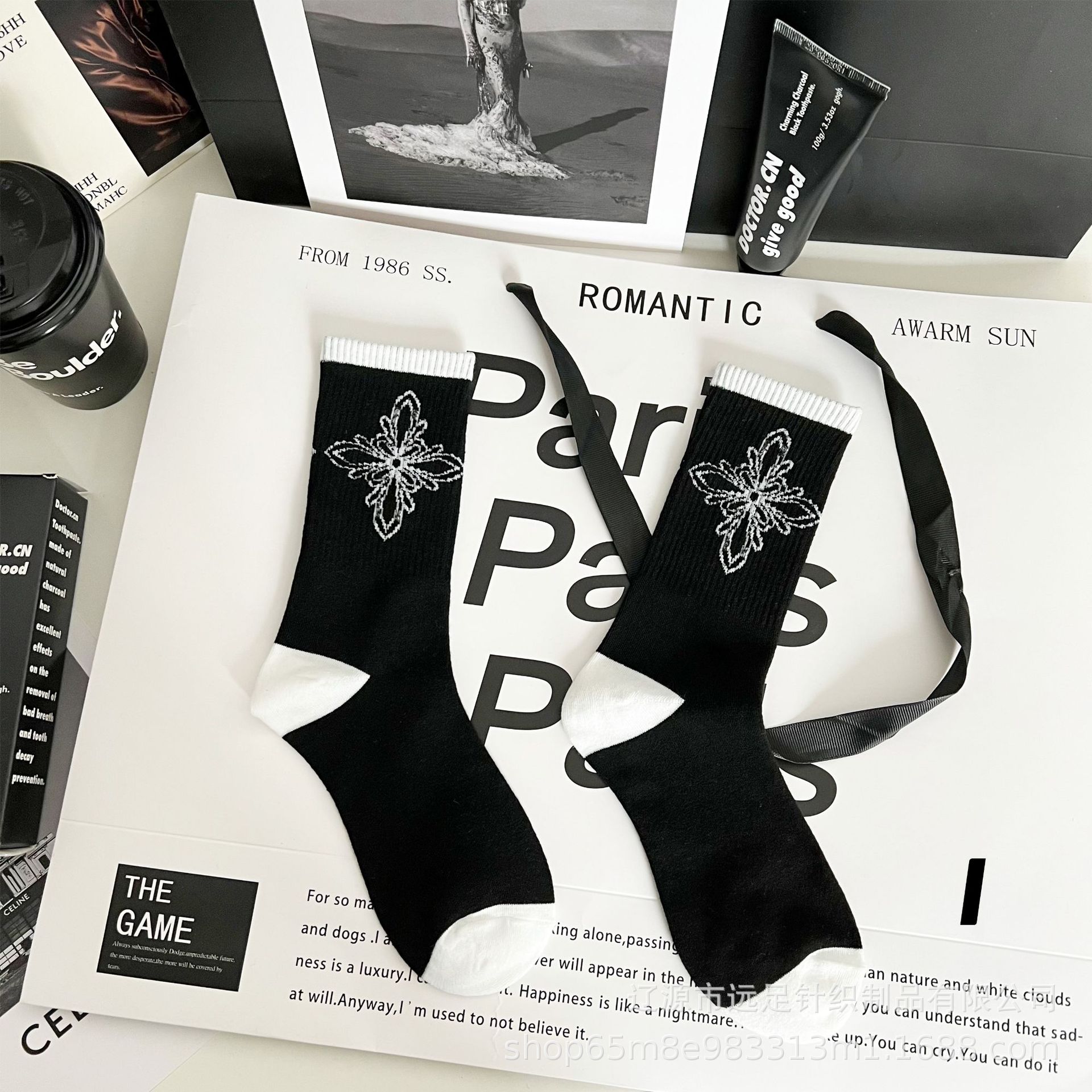 새로운 하이킹 제품 유럽과 미국의 하이 스트리트 트렌디 양말 크로스 꽃 양말 여성용 중간 길이 양말 인터넷 인기있는 모든 경기 학술 스타일 블랙 스타킹