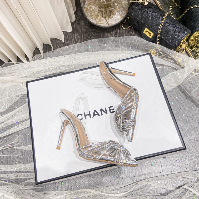 2025 봄/여름 신상 유럽 및 미국 스타일 초하이힐 샌들 여성용 뾰족코 필름 크리스탈 얇은 굽 로마 스타일 뒷끈 여성화스토어 가기