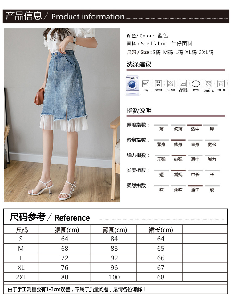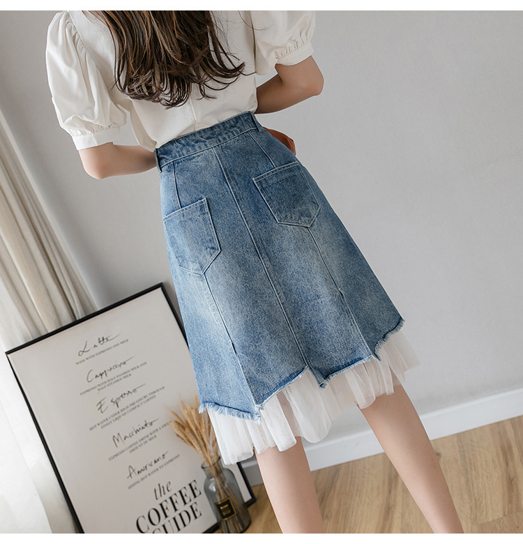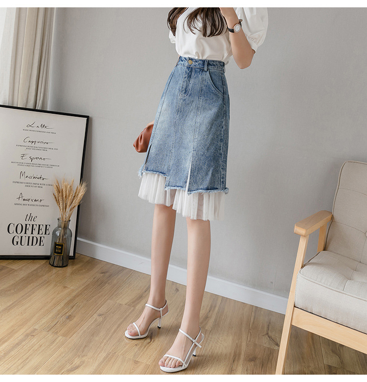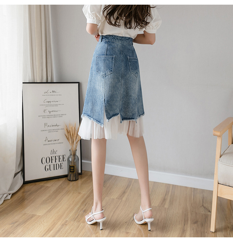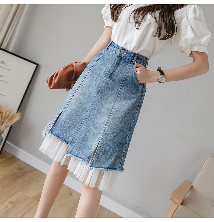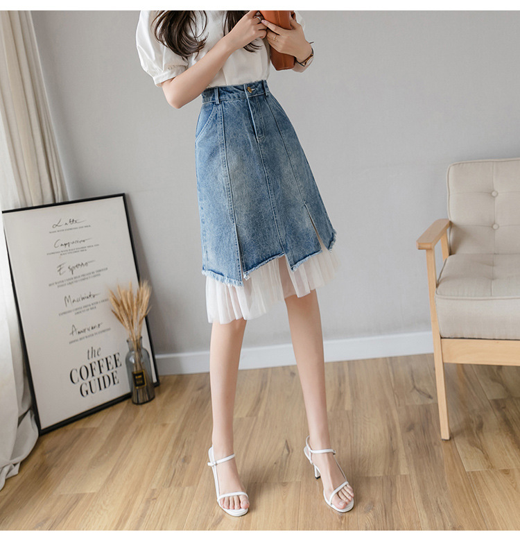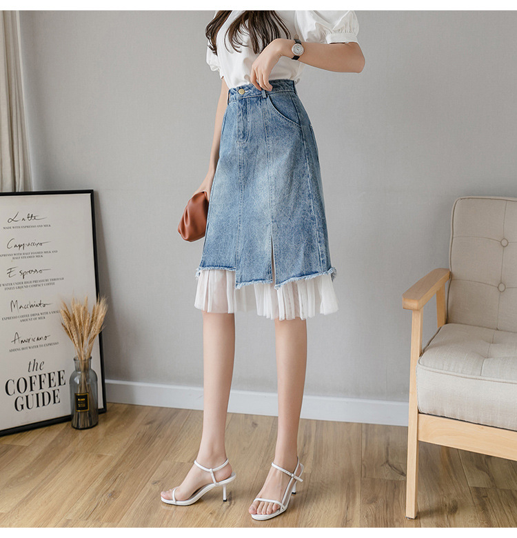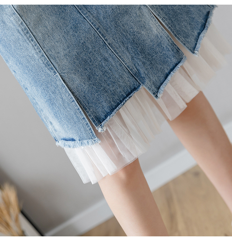 실제 사진, 2025년 봄/여름 신상 트렌디하고 다재다능한 데님과 메쉬 소재의 여성용 힙허깅 롱 스커트스토어 가기