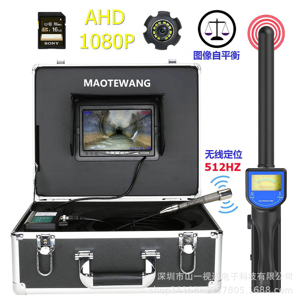 型号:F927ADFBAB8R-30M 配置:自平衡,摄像机内置512HZ发射定位,5M以上512HZ管道破损定位接收器,7寸录像屏送16G卡,直径23mm不锈钢探头,高清1080P ,镜头角度145度,蓝宝石镜片,直径5MM/30米管线,4500MA内置电池,带电量显示,12个白光灯亮度可调,带二个摄像头保护套。