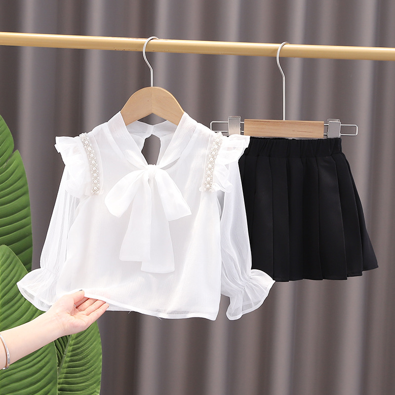 여아 세트 2023 봄과 가을 새로운 아기 소녀 쉬폰 활 3 셔츠 세련된 플리츠 스커트 투피스 세트 2-4