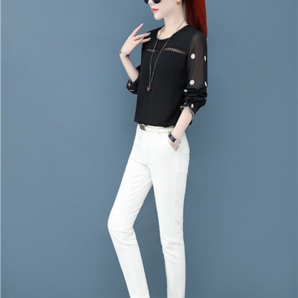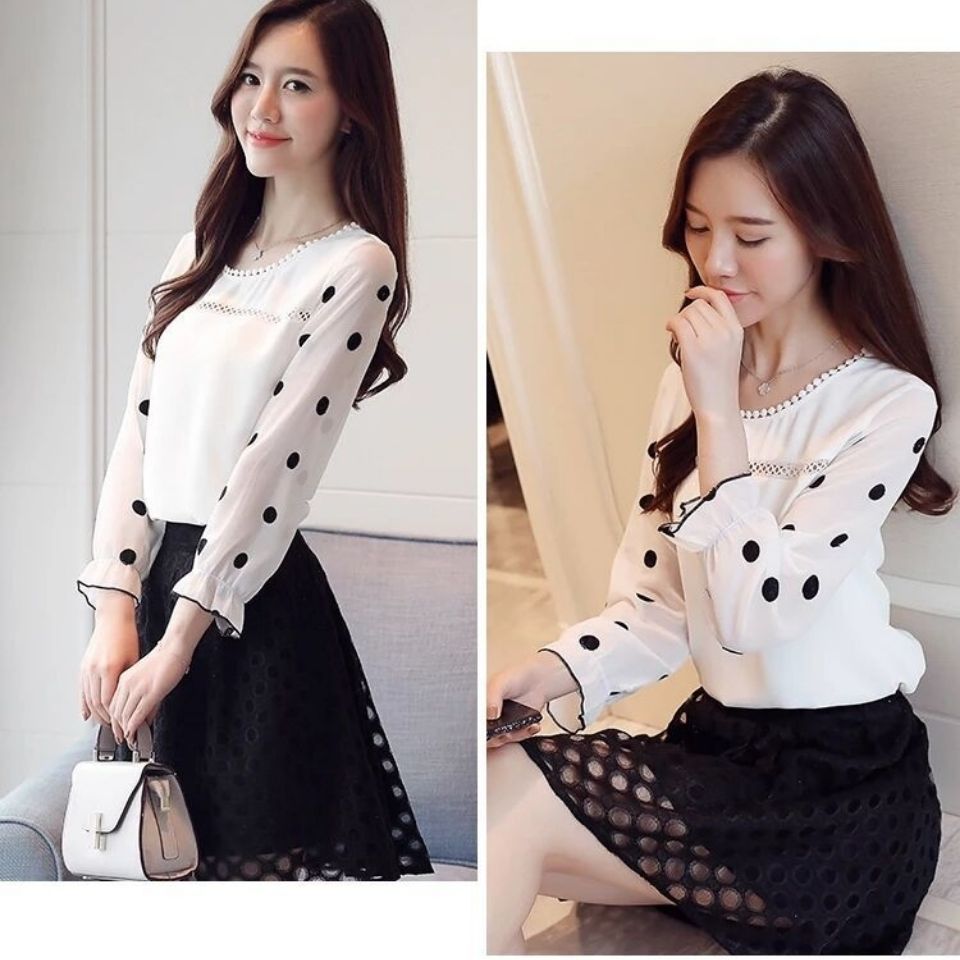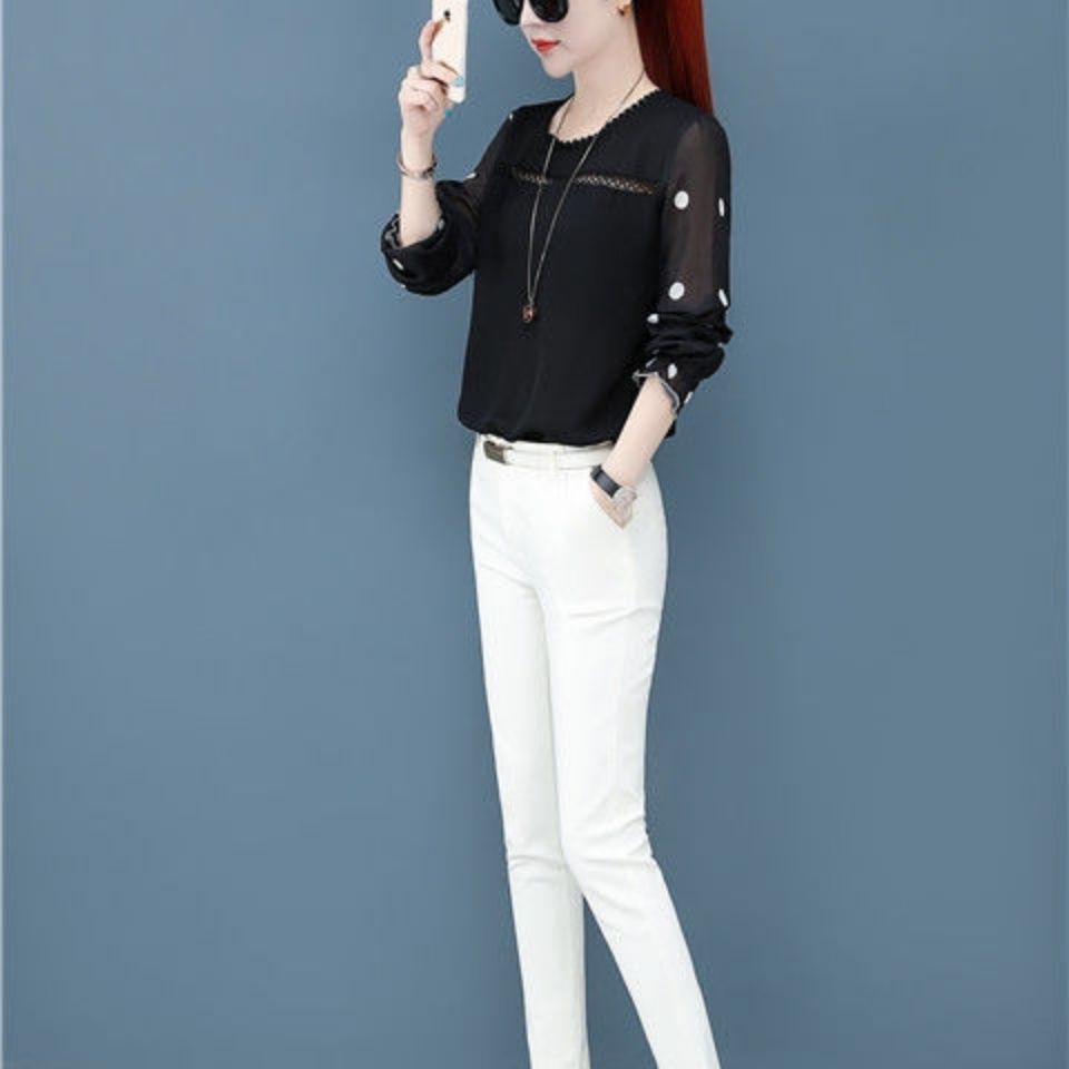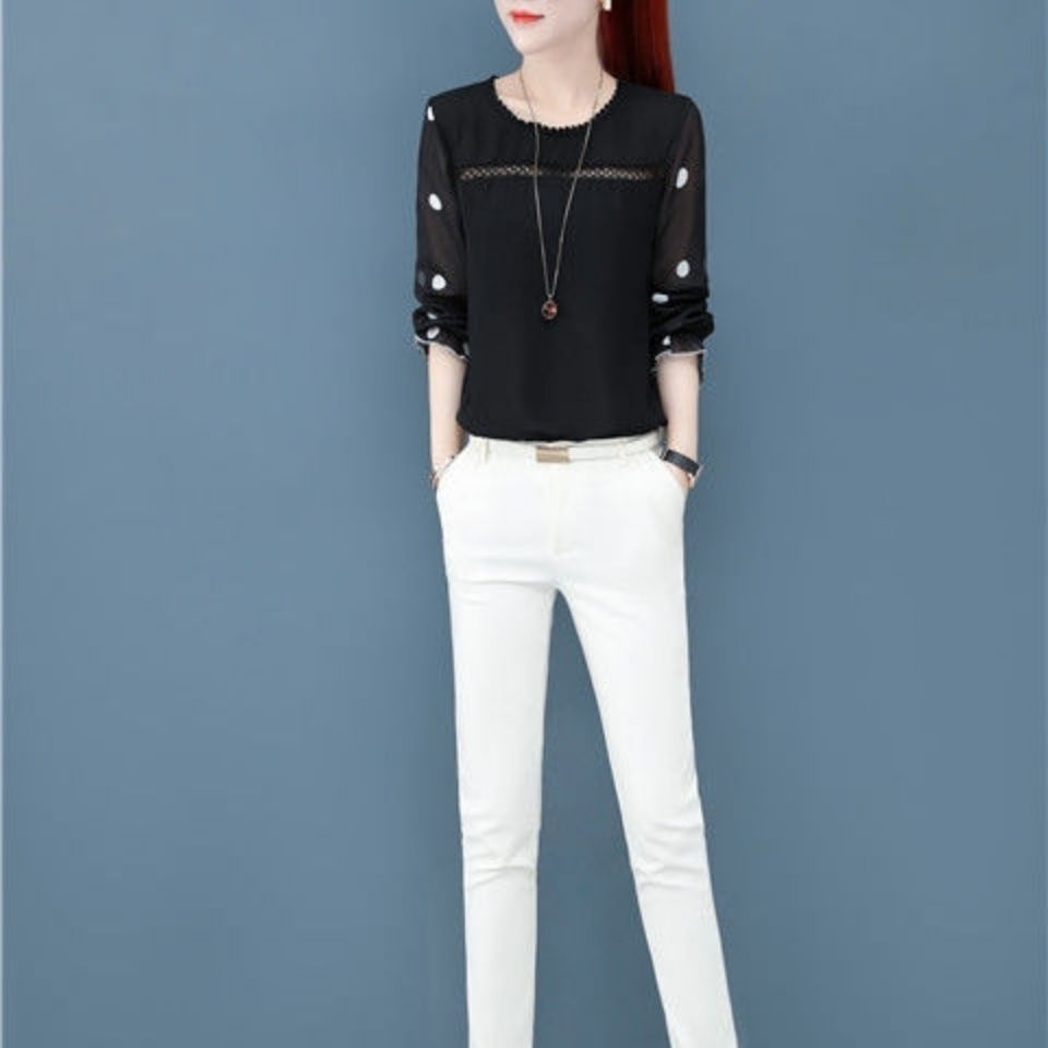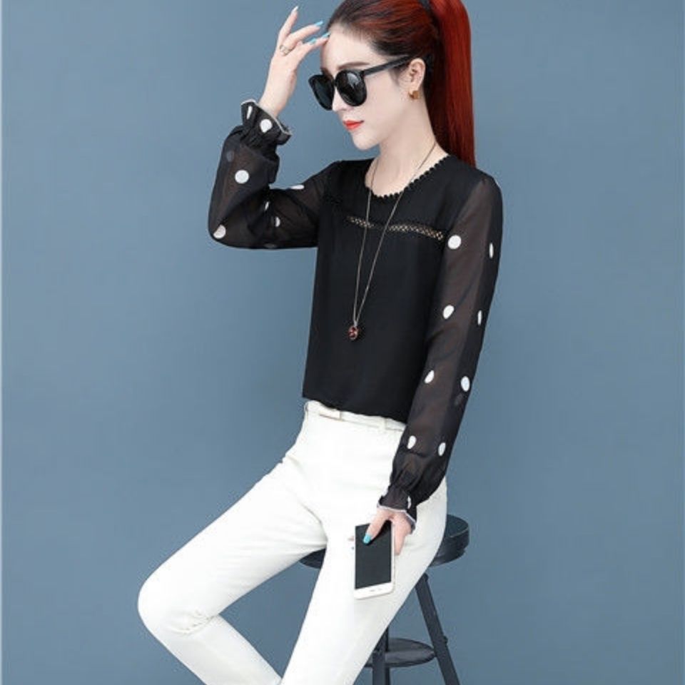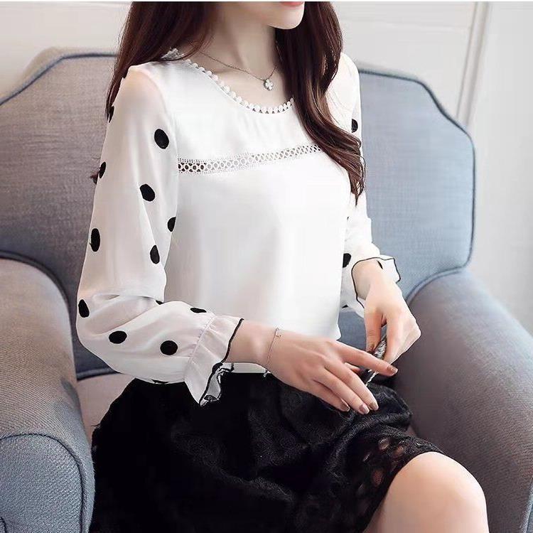 2023 봄과 가을 새로운 스타일 셔츠 여성용 긴 소매베이스 셔츠 폴카 포인트 라운드 넥 긴 소매 신선한 달콤한 레이스 옷스토어 가기