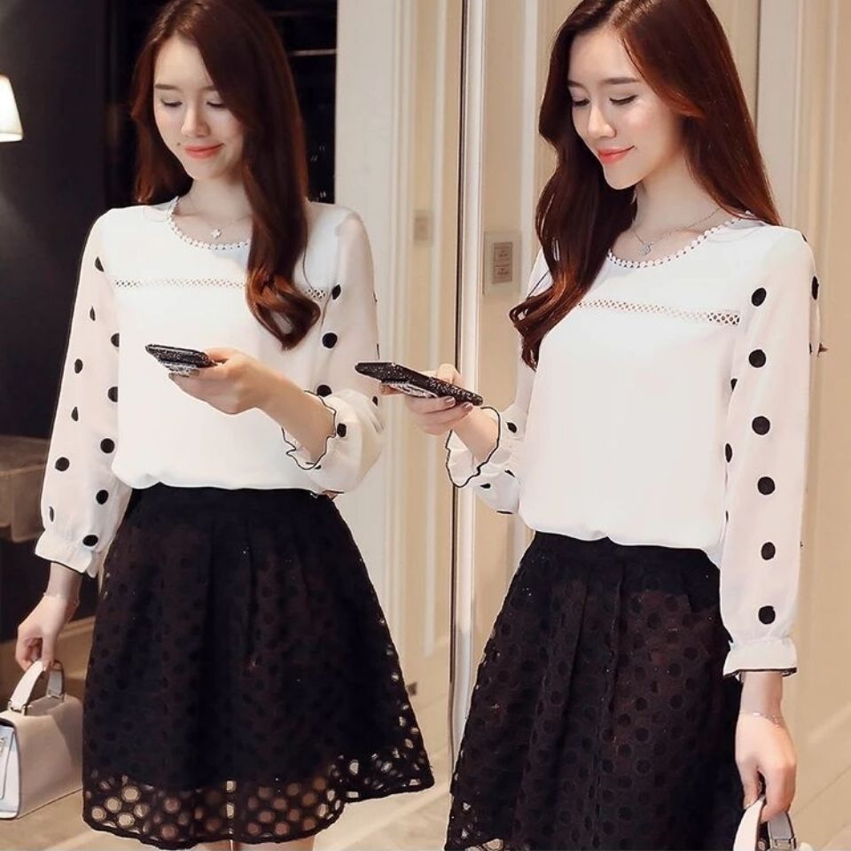2023 봄과 가을 새로운 스타일 셔츠 여성용 긴 소매베이스 셔츠 폴카 포인트 라운드 넥 긴 소매 신선한 달콤한 레이스 옷