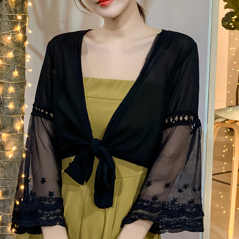 여름 겉옷 얇은 카디건 반팔 태양 보호 의류 여성용 레이스 슬립 스커트가있는 올매치 쉬폰 탑스토어 가기