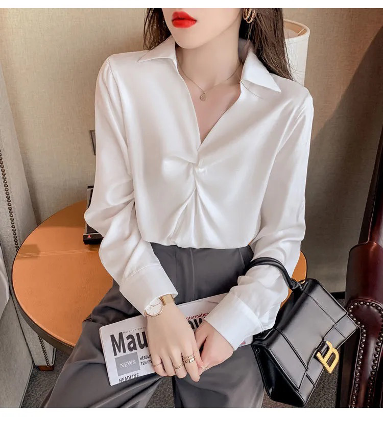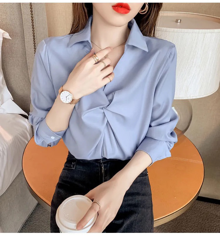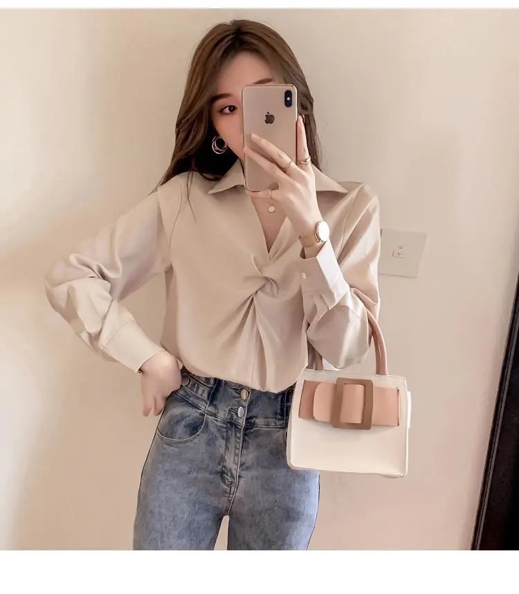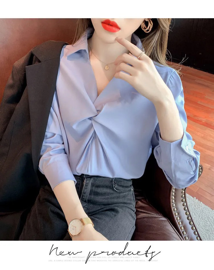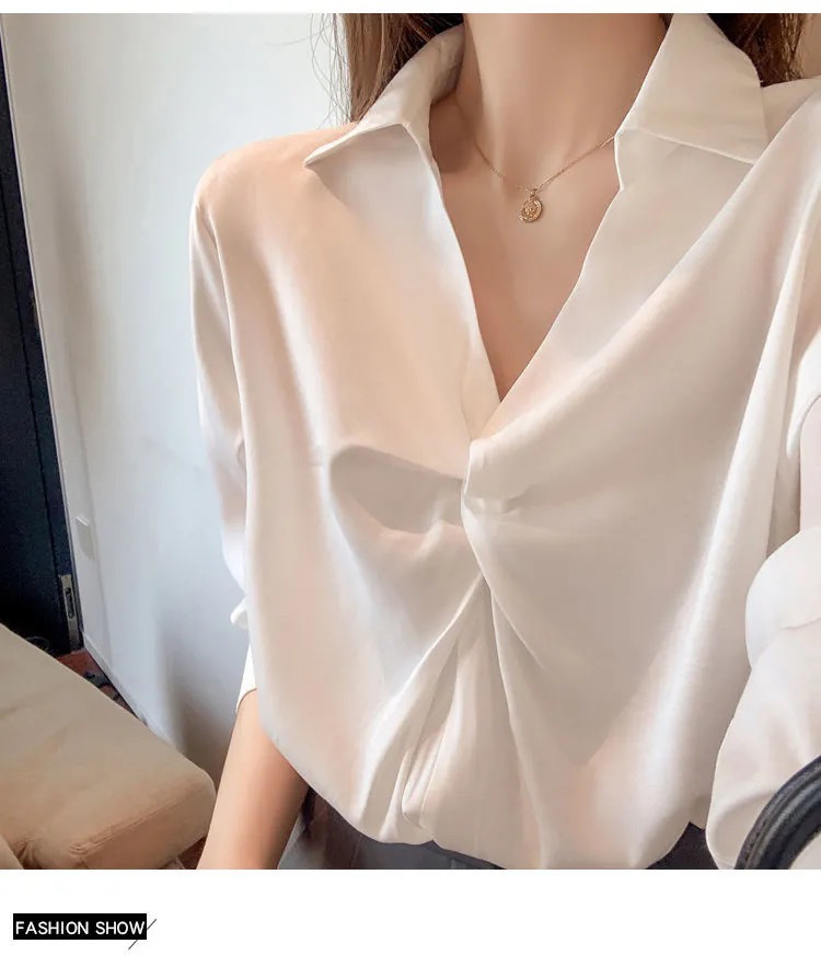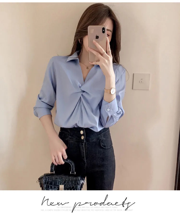 봄 새로운 패션 세련된 셔츠 여성용 긴팔 느슨한 캐주얼 V 넥 쉬폰 탑 Pleated 하프 오픈 칼라 셔츠
