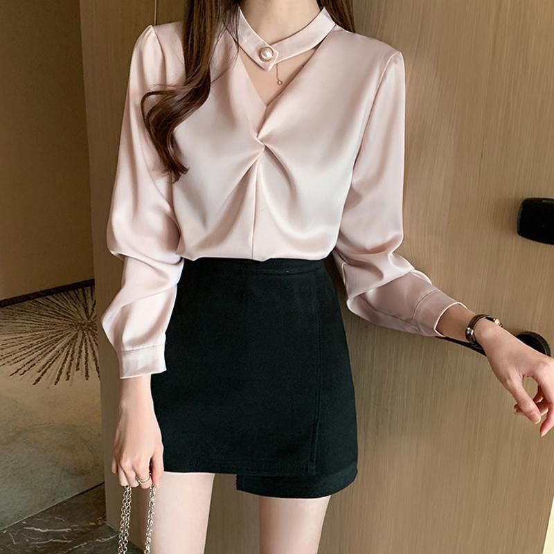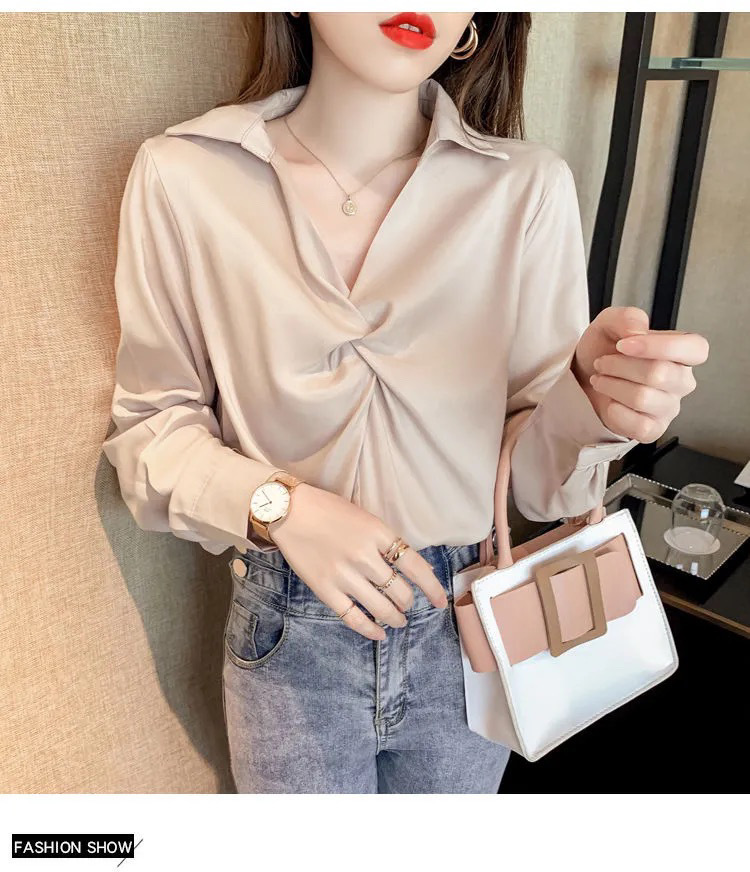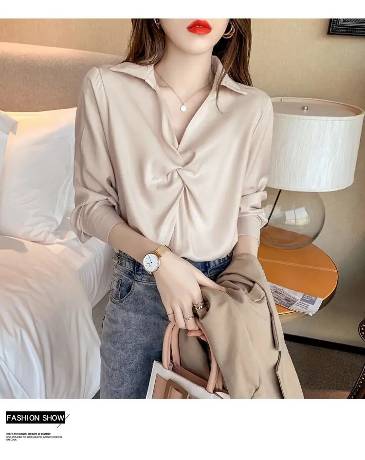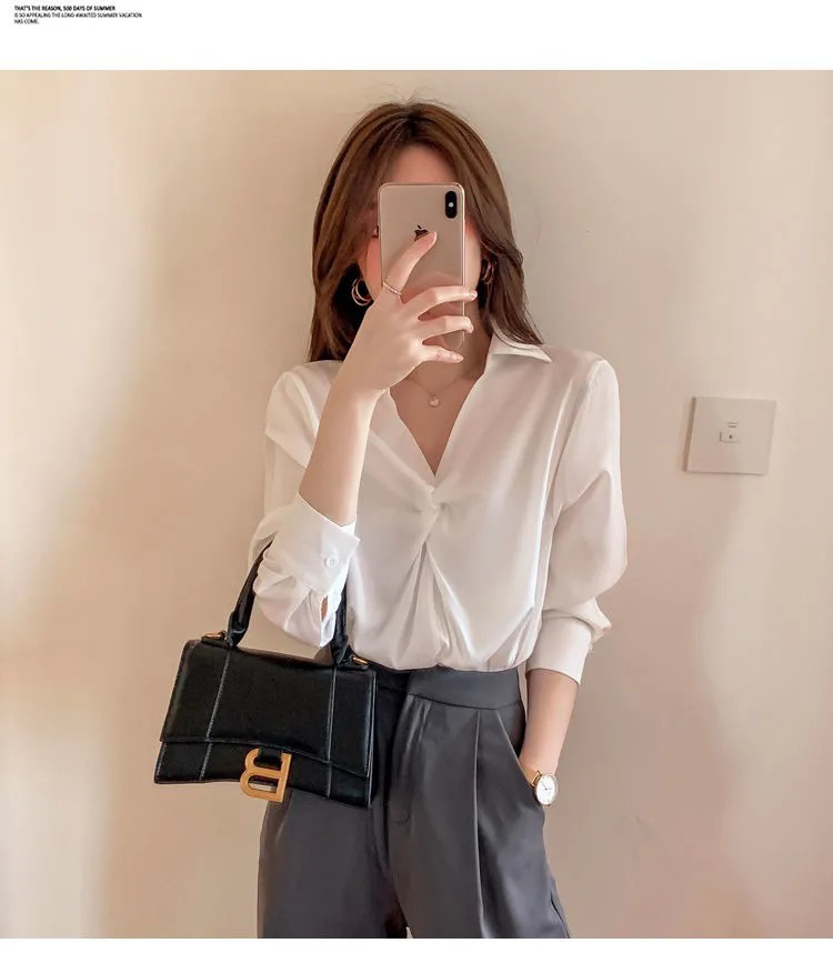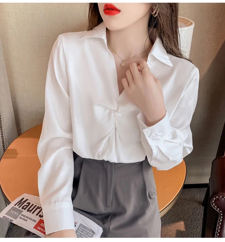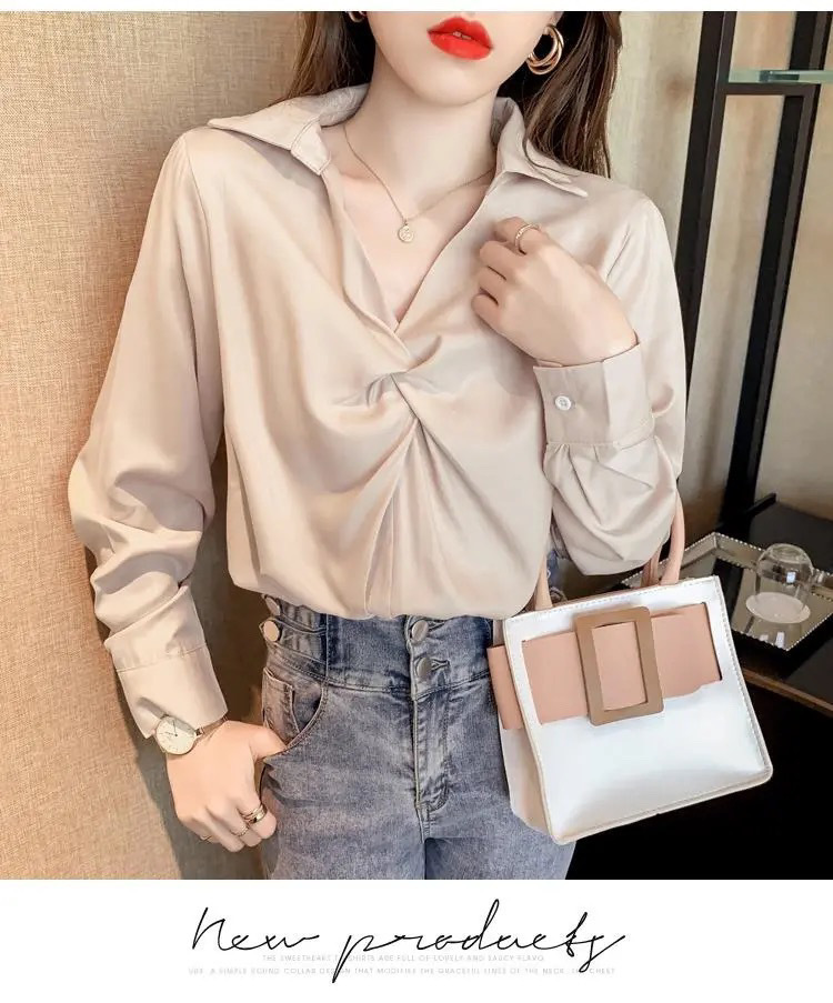 봄 새로운 패션 세련된 셔츠 여성용 긴팔 느슨한 캐주얼 V 넥 쉬폰 탑 Pleated 하프 오픈 칼라 셔츠