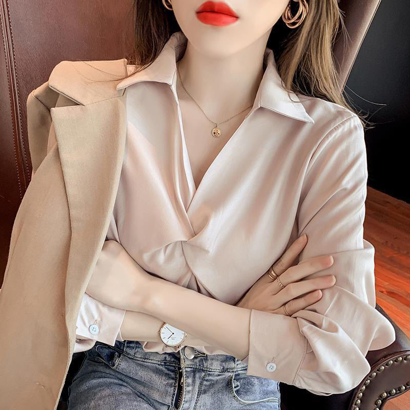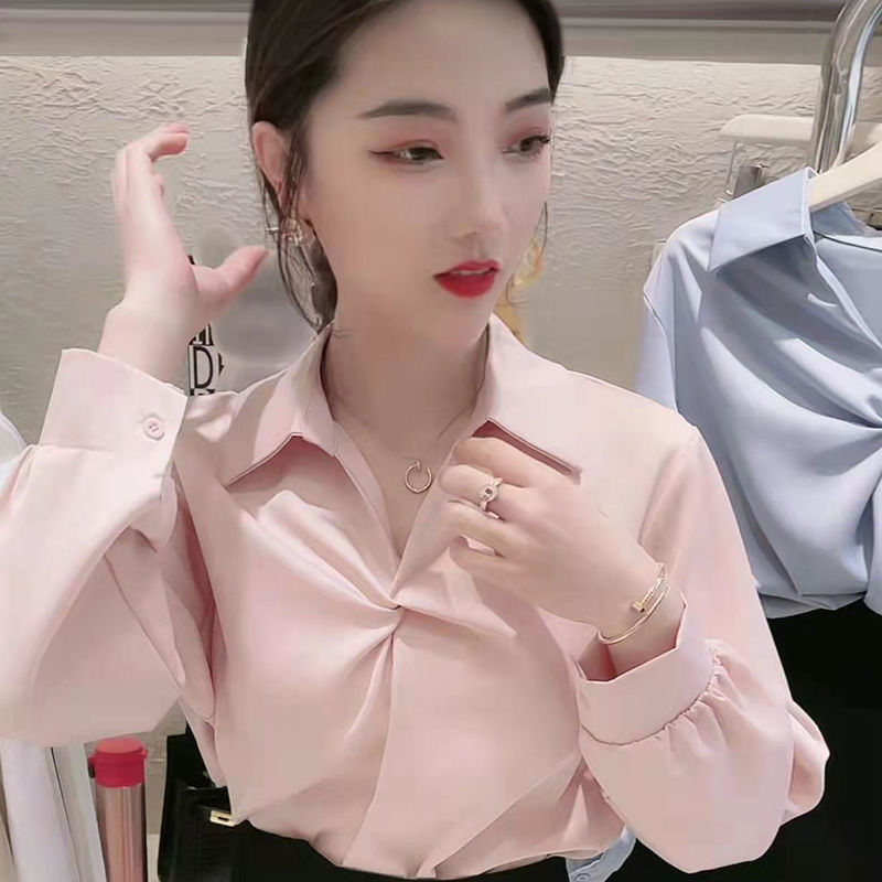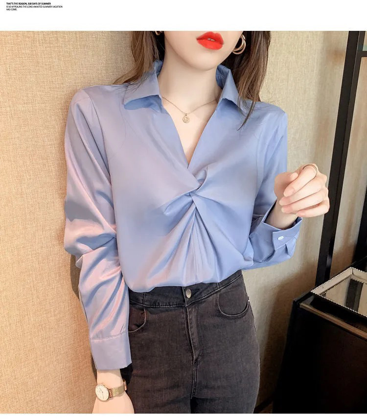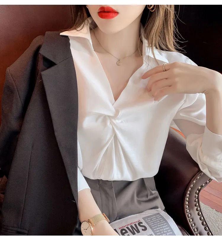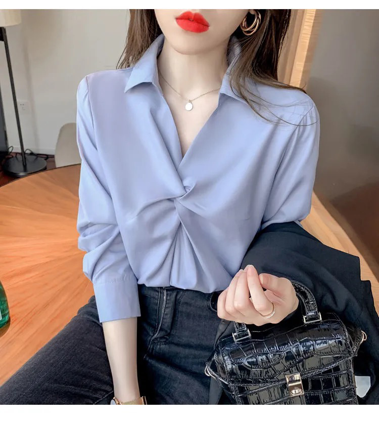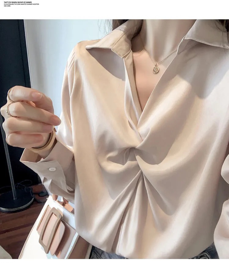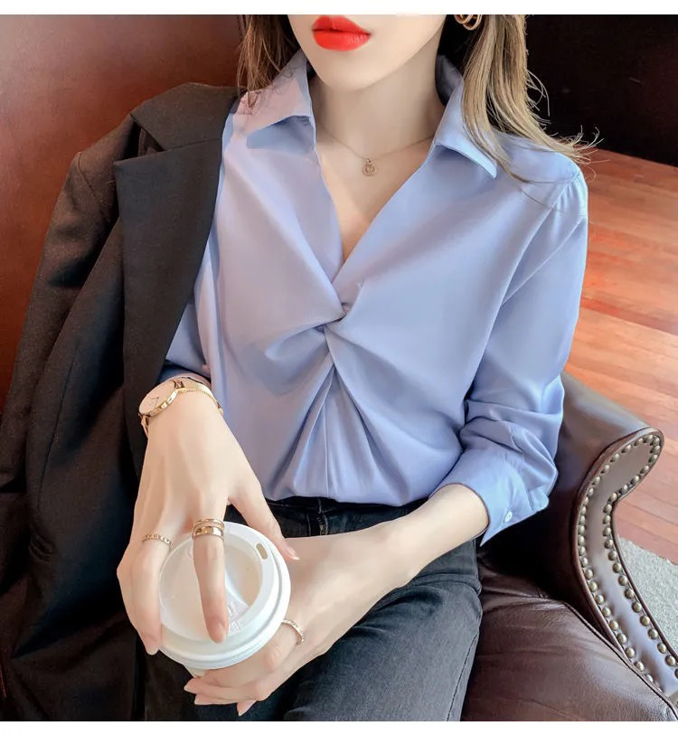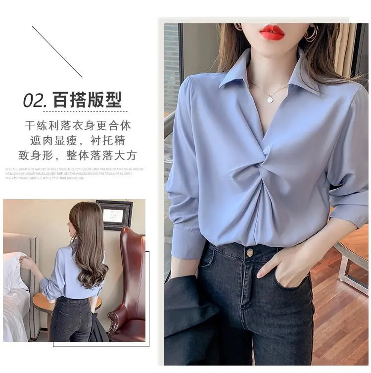 봄 새로운 패션 세련된 셔츠 여성용 긴팔 느슨한 캐주얼 V 넥 쉬폰 탑 Pleated 하프 오픈 칼라 셔츠스토어 가기