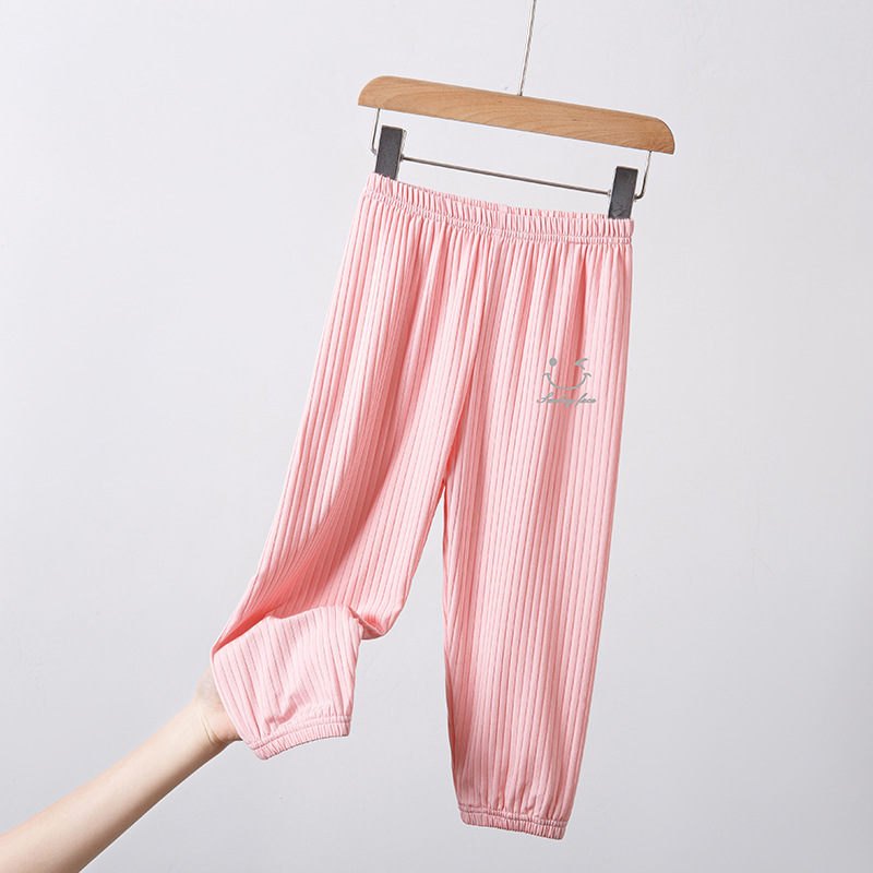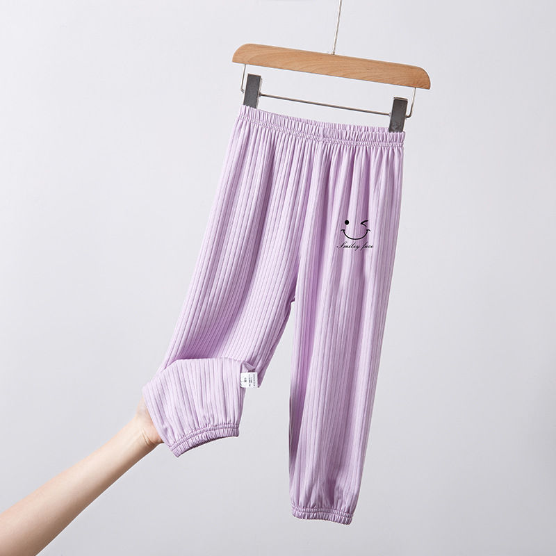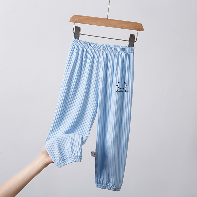여름 시원한 수축 바지 소년과 소녀를위한 아이스 실크 모기 방지 바지 아기 색 스마일 에어컨 바지 홈 쉐이크 오프 바지