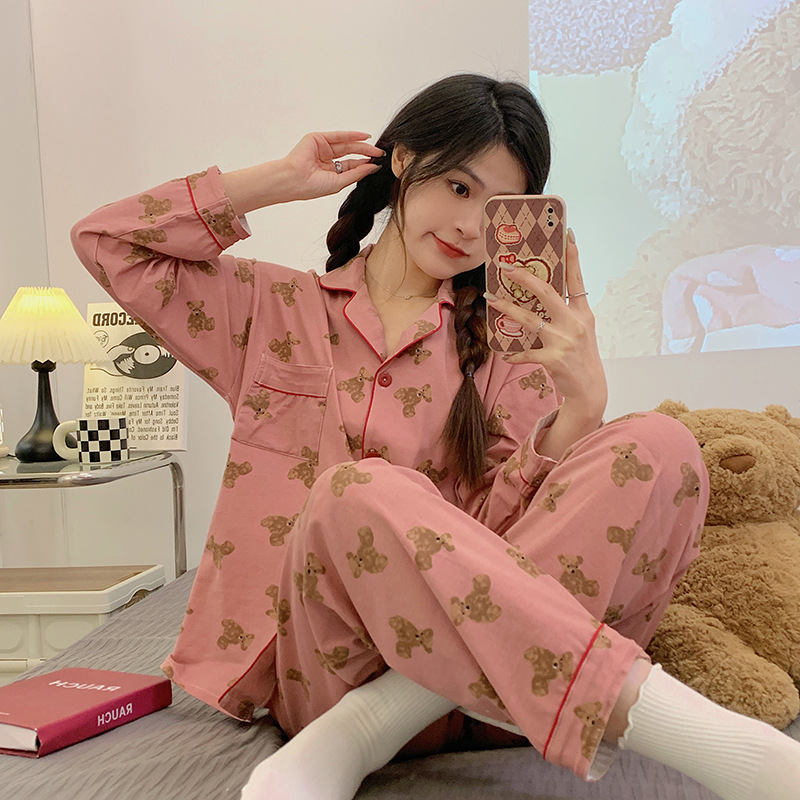 새로운 기능 잠옷 여성 간단한 줄무늬 그물 빨간색 긴 소매 카디건 소녀 한국어 얇은 Homewear 정장 도매