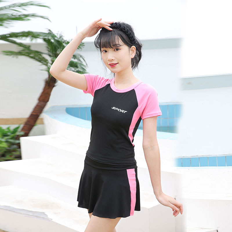 수영복 여성용 보수적 인 플랫 앵글 스플릿 스커트 반팔 태양 보호 전문 스포츠 벨트 가슴 패드 수영 훈련 온천 수영복