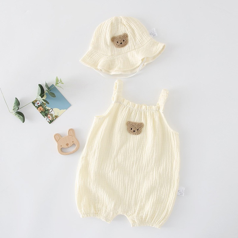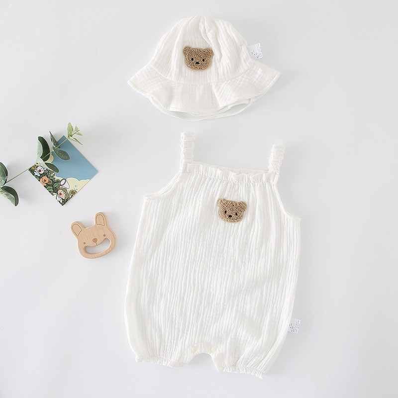 신생아 남녀 아기 여름 거즈 멜빵 점프슈트, 바디슈트, 태양모자, 멜빵 크롤링슈트