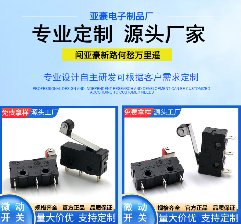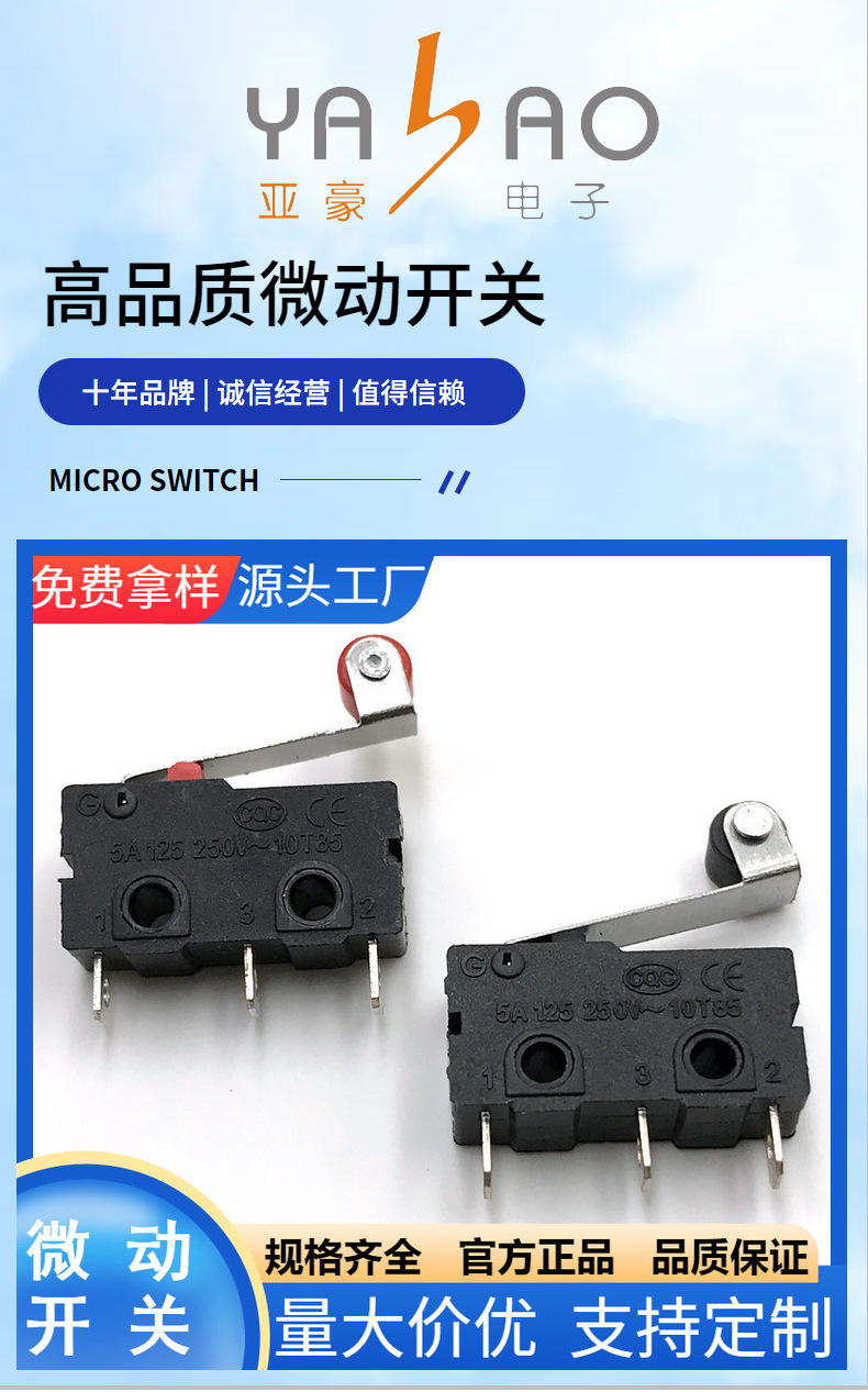 亚豪供应高品质弯柄相机微动开关 耐温行程复位触动开关 厂家批发