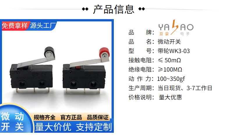 鼠标带轮微动开关WK3-03 行程中微动开关限位复位式开关 东莞批发