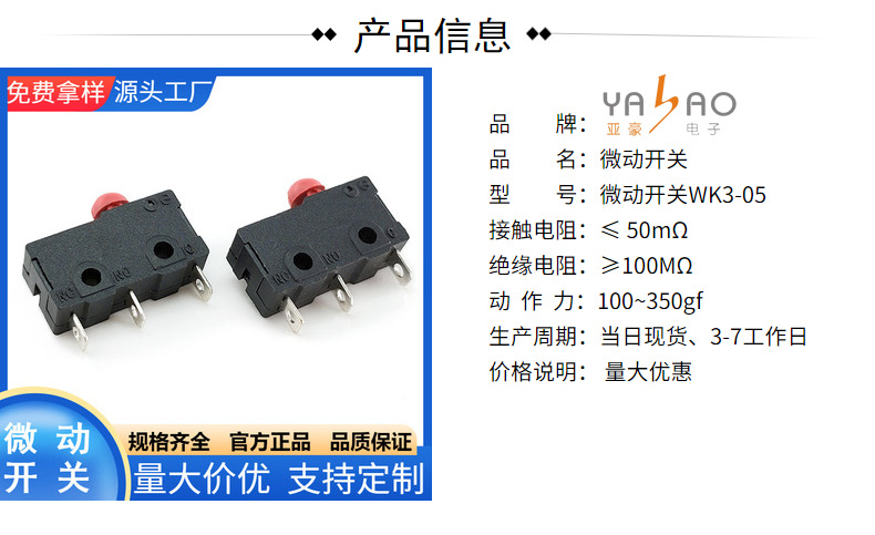 鼠标微动开关 批发各种WK系列 耐温复位小型微动开关 wk-01无压板