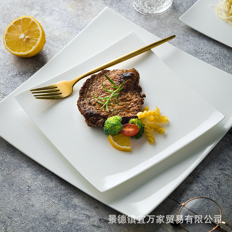 Jingdezhen 순수 화이트 본 중국 스테이크 플레이트 심플 스퀘어 서양 음식 플레이트 호텔 레스토랑 크리에이티브 플랫 플레이트 얕은 스테이크