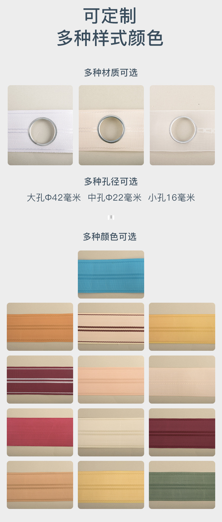 공장에서 커튼용 천공 원단, 직조 테이프, 로마 링, 두꺼운 섬유 테이프, 부자재 및 액세서리를 재고 보유하고 있으며, 한국으로 직송합니다.