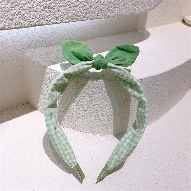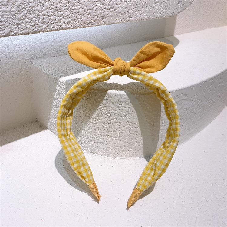 한국식 어린이 격자 무늬 패브릭 넓은 챙 헤어 후프 작은 신선한 활 토끼 귀 머리띠 어린 소녀의 모자 헤어 클립