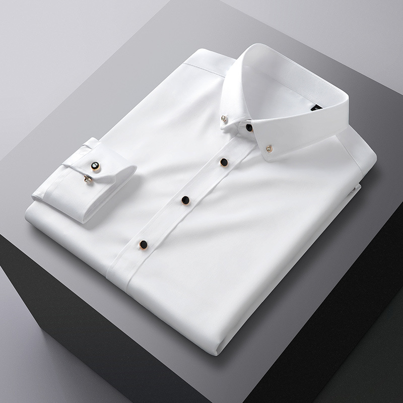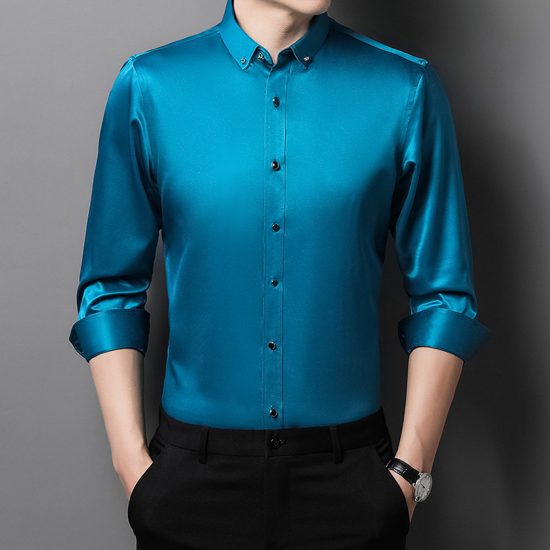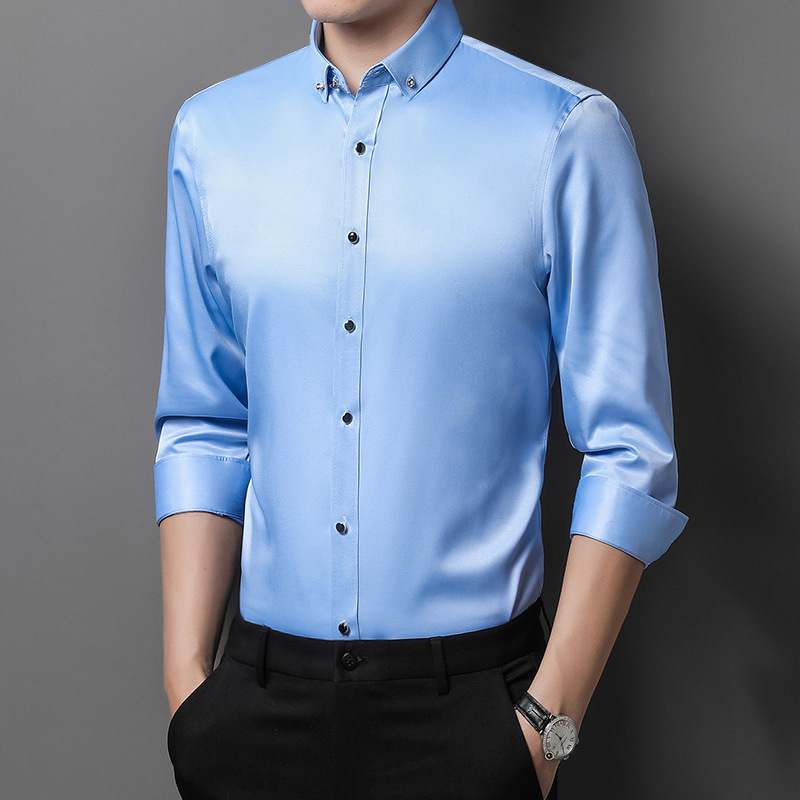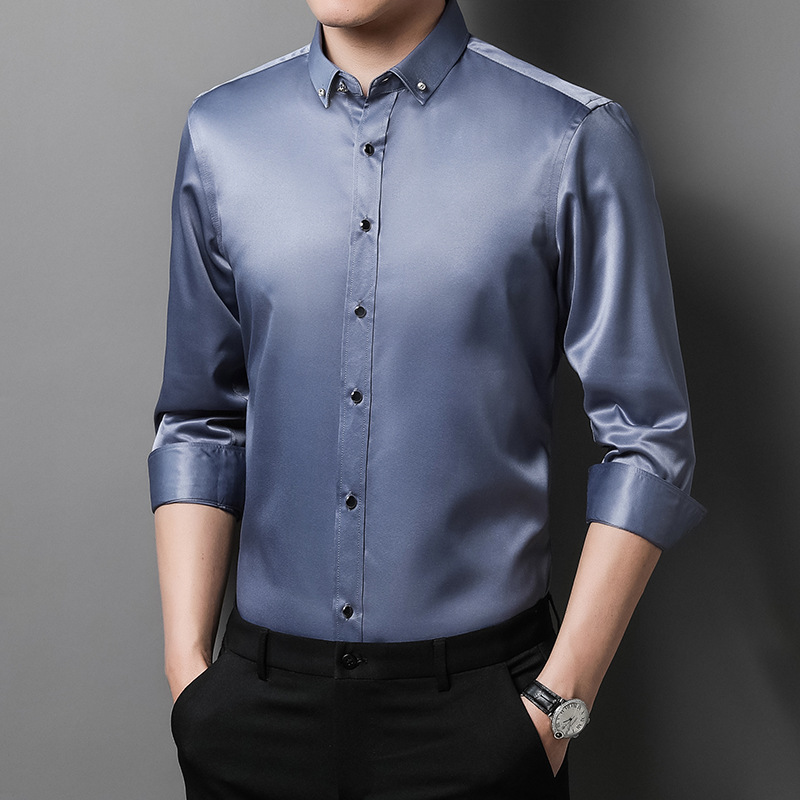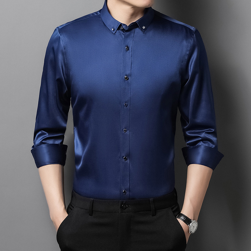 봄과 가을 가벼운 럭셔리 실크 슬라이드 긴팔 셔츠 남성용 슬림핏 탄성 비 다림질 작업 셔츠 남성용 단색 비즈니스 셔츠