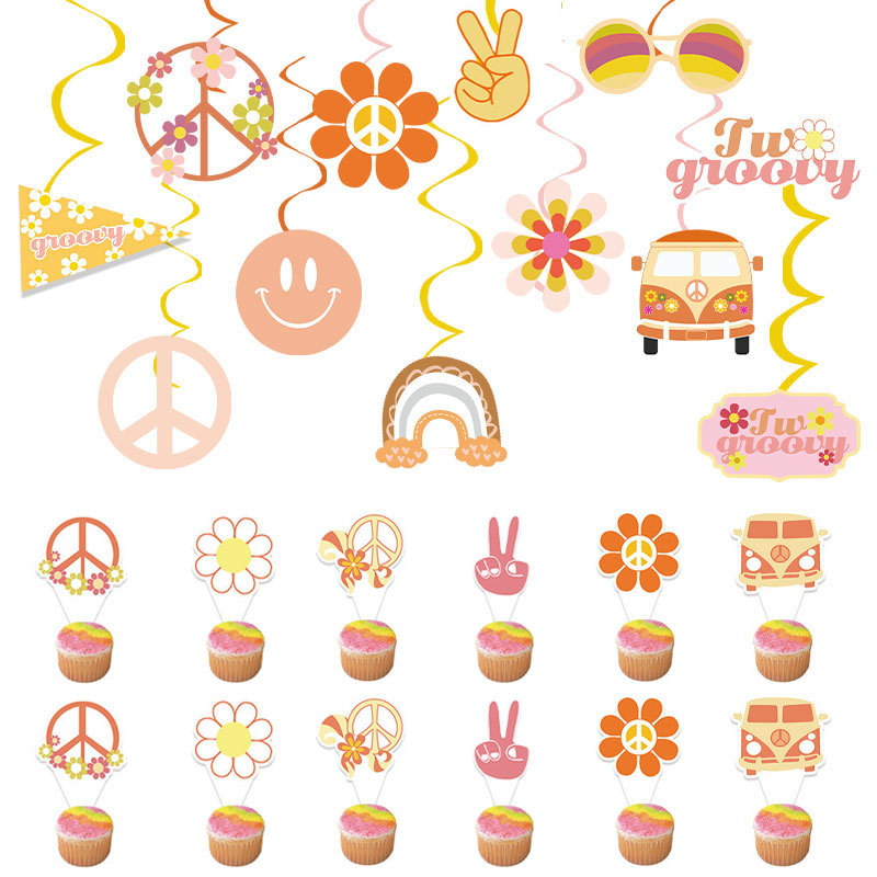 嬉皮士主题派对复古Two Groovy宝宝周岁螺旋吊饰蛋糕插旗套餐派对装饰