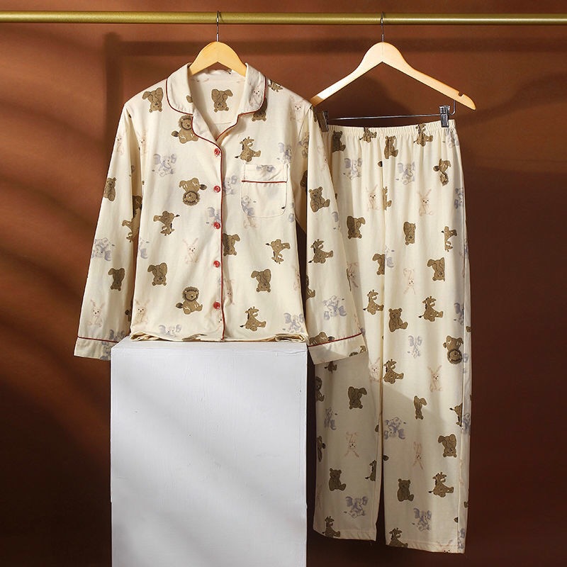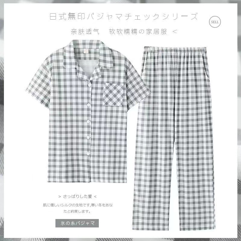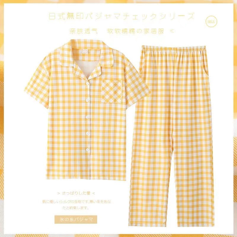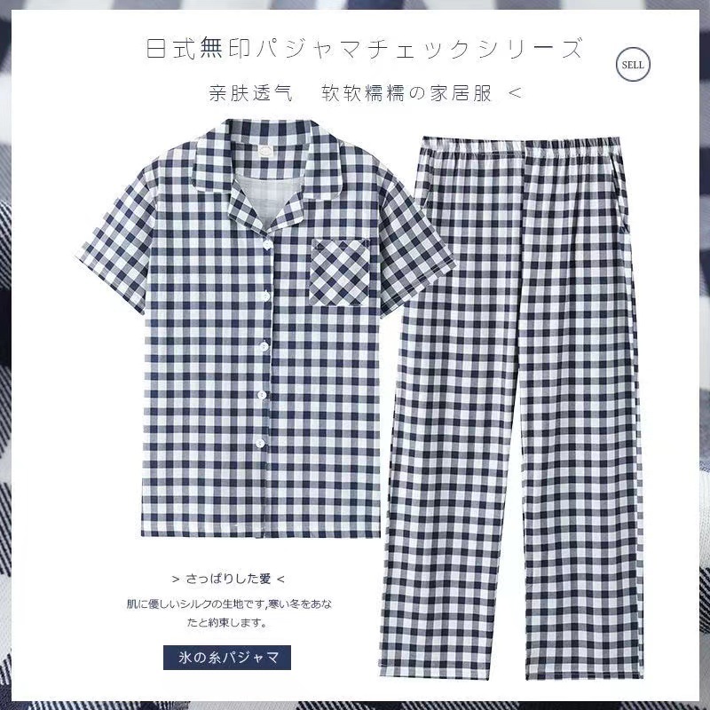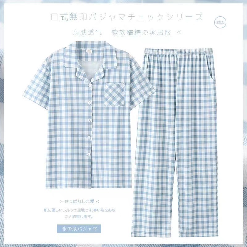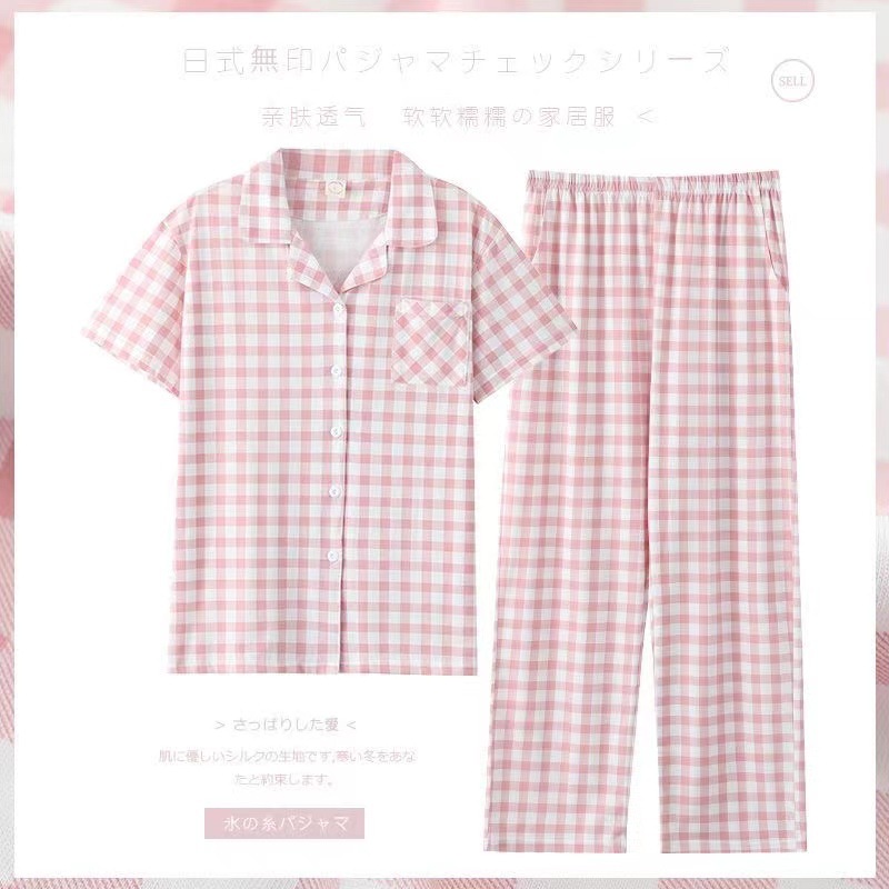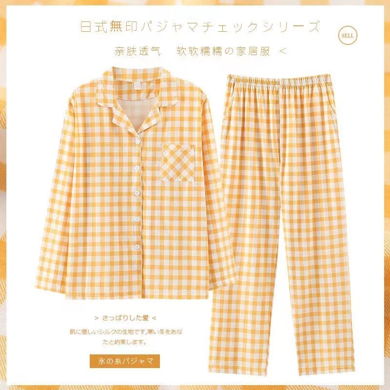 여름 얇은 순수 면화 긴팔 잠옷 여성 정장 격자 무늬 카디건 문학 여성 여름 신제품 귀여운 면화 가정 의류스토어 가기