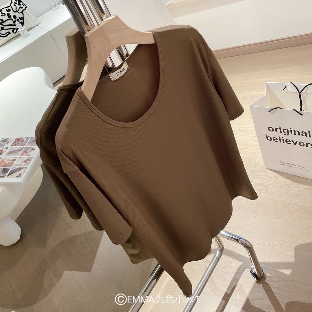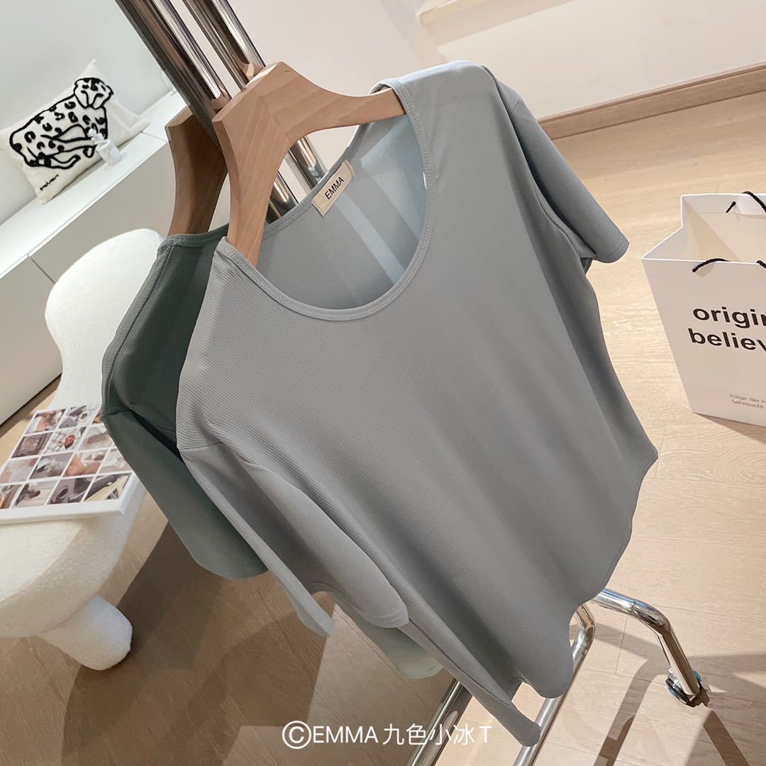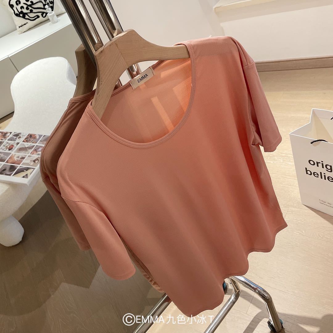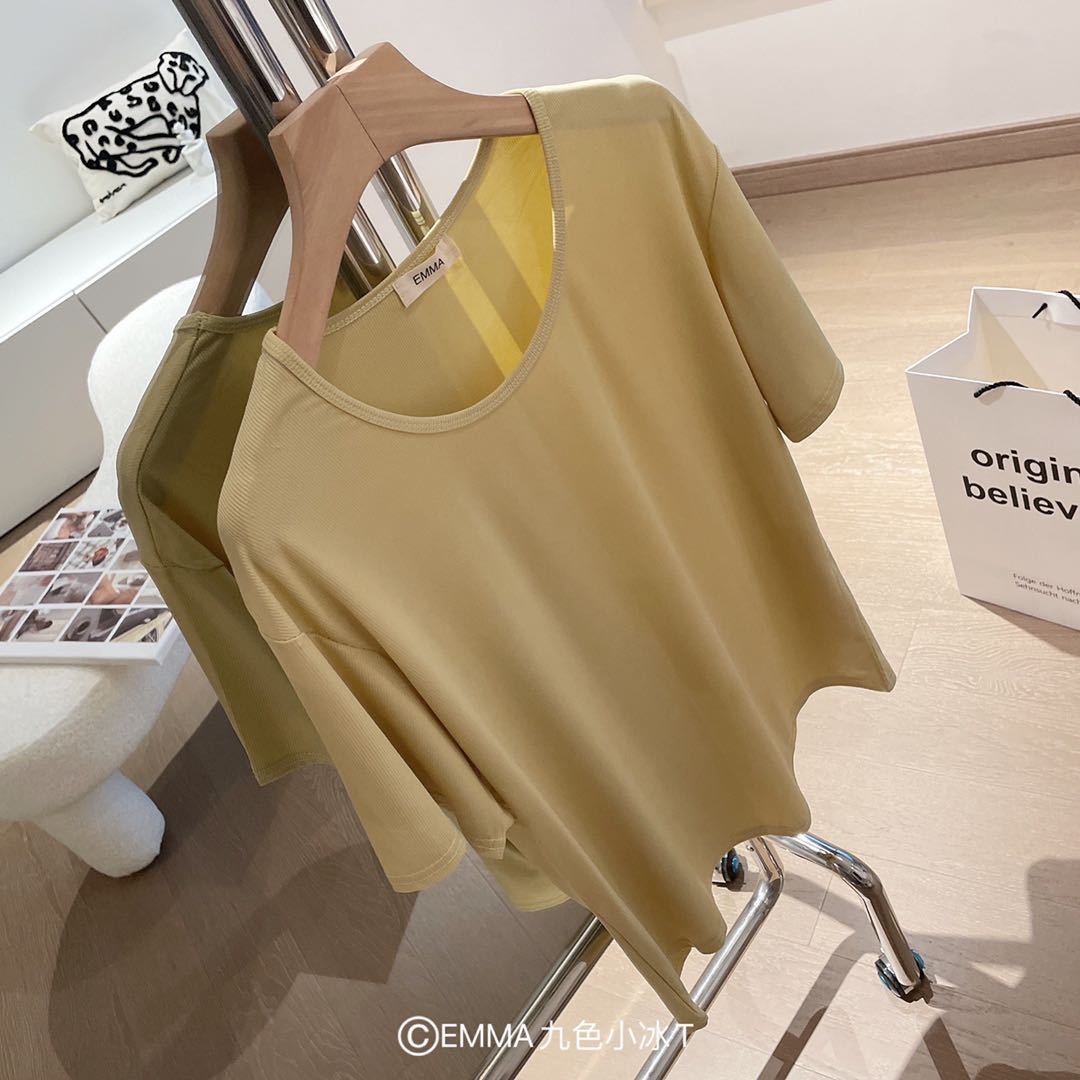 2025 여름 신작 EMMA 9 색 스몰 아이스 티셔츠 루즈 솔리드 컬러 탑 인 트렌디 라운드 넥 티셔츠 여성 반팔스토어 가기