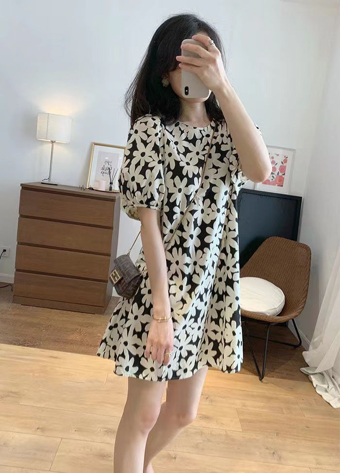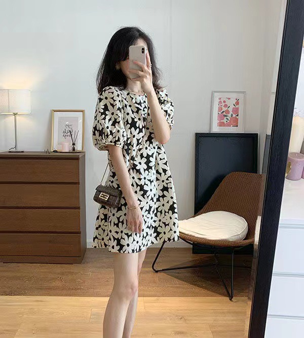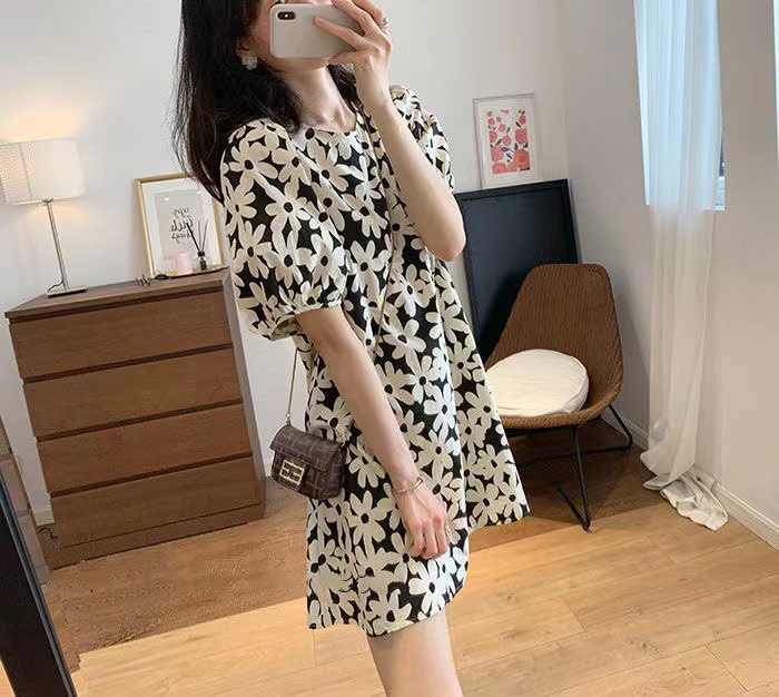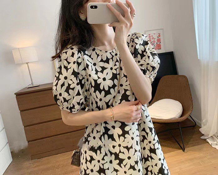 빈티지 연령 감소 인쇄 원피스 여성의 여름 신상품 프랑스 스타일 달콤한 퍼프 슬리브 느슨한 슬리밍 A 라인 스커트 in 트렌디