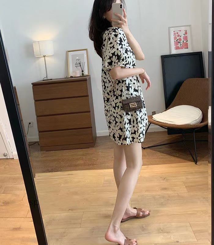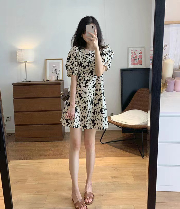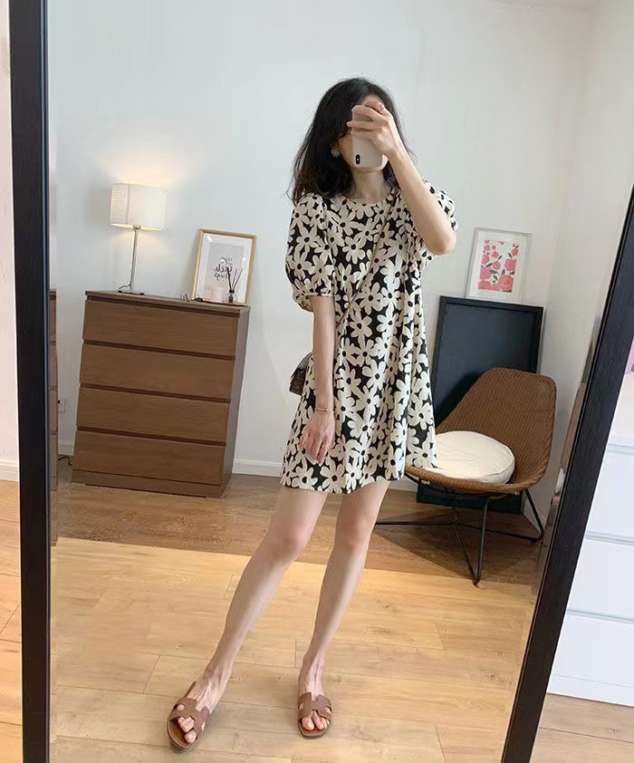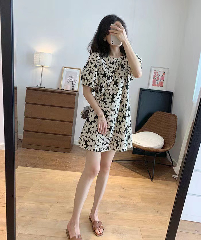 빈티지 연령 감소 인쇄 원피스 여성의 여름 신상품 프랑스 스타일 달콤한 퍼프 슬리브 느슨한 슬리밍 A 라인 스커트 in 트렌디스토어 가기