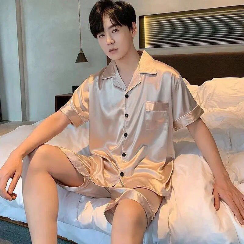 2024 새로운 솔리드 컬러 아이스 실크 파자마 여름 얇은 캐주얼 반팔 반바지 카디건 남성 홈 의류 투피스 세트스토어 가기