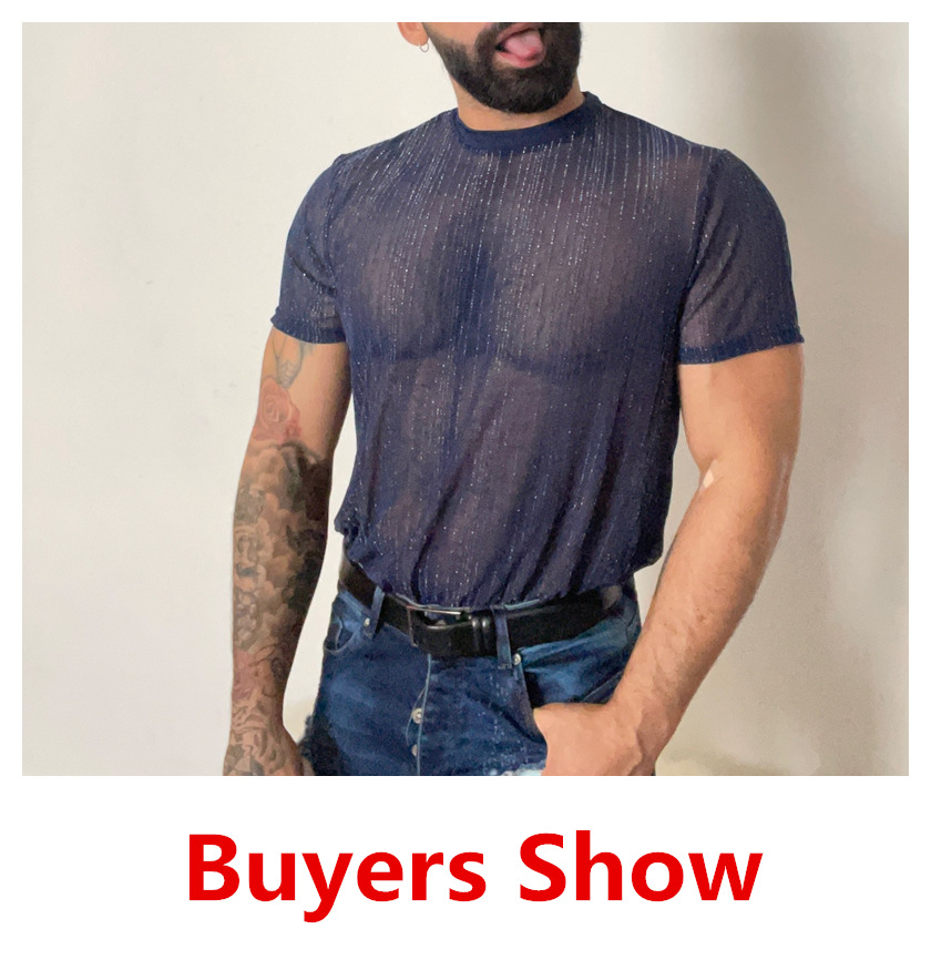 AliExpress 관점 얇은 통기성 패션 나이트 클럽 파티베이스 셔츠 유럽과 미국 남성용 메쉬 섹시한 남성용 티셔츠스토어 가기