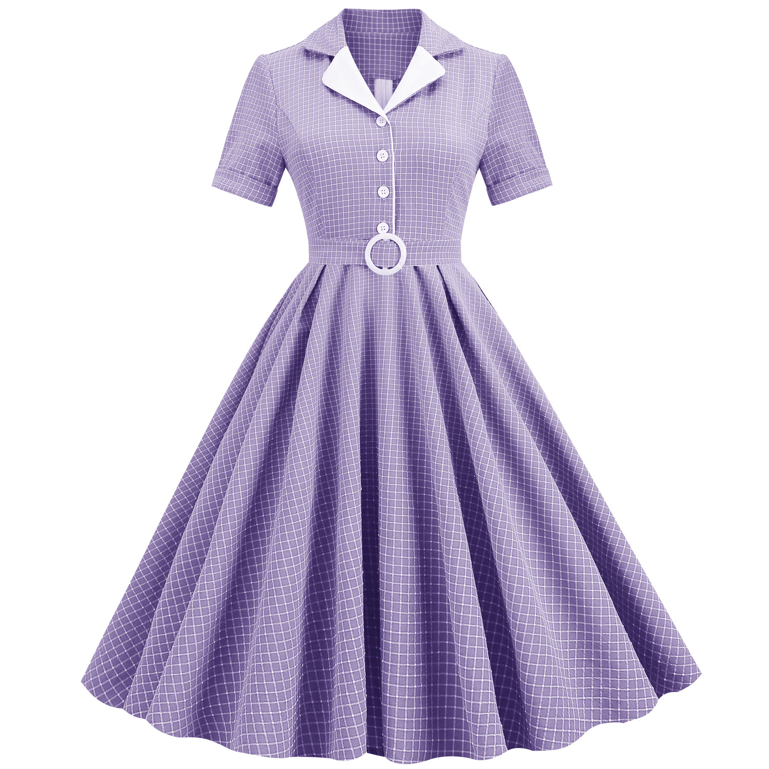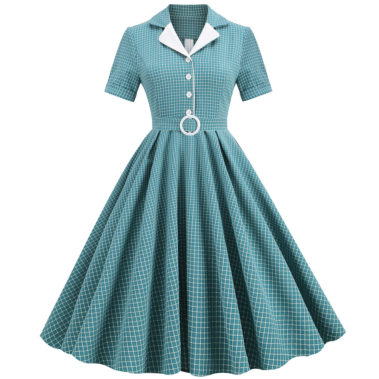 크로스 보더 햅번 스트리트 대비 색상 세트 칼라 격자 무늬 스트레치 슬림 핏 레이스 업 대형 스윙 중간 길이 복고풍 원피스 여성스토어 가기