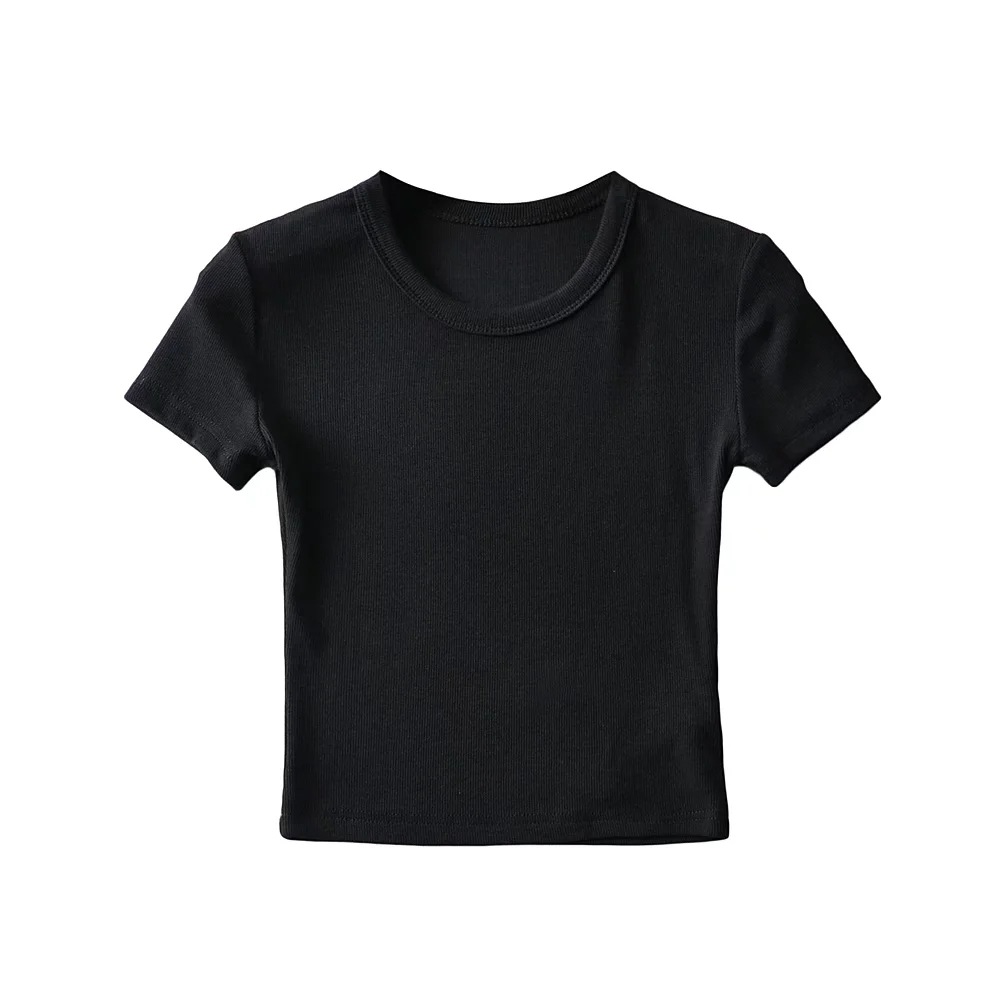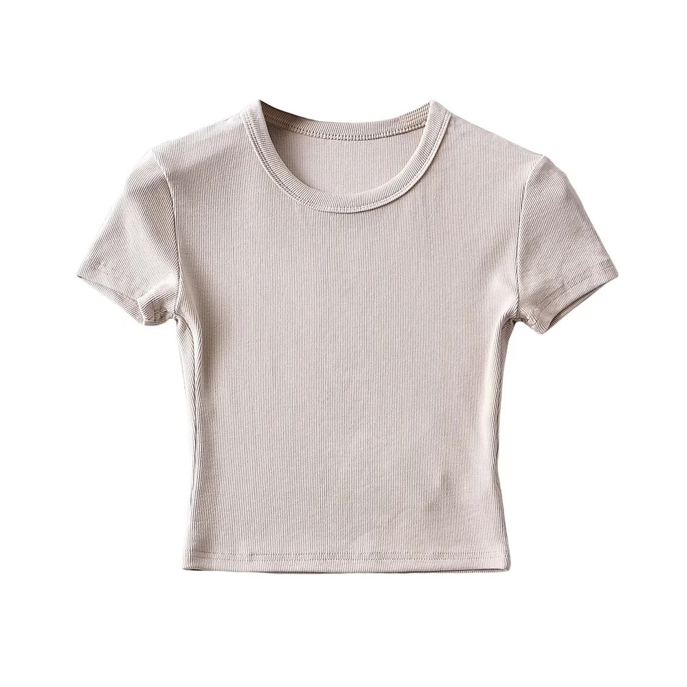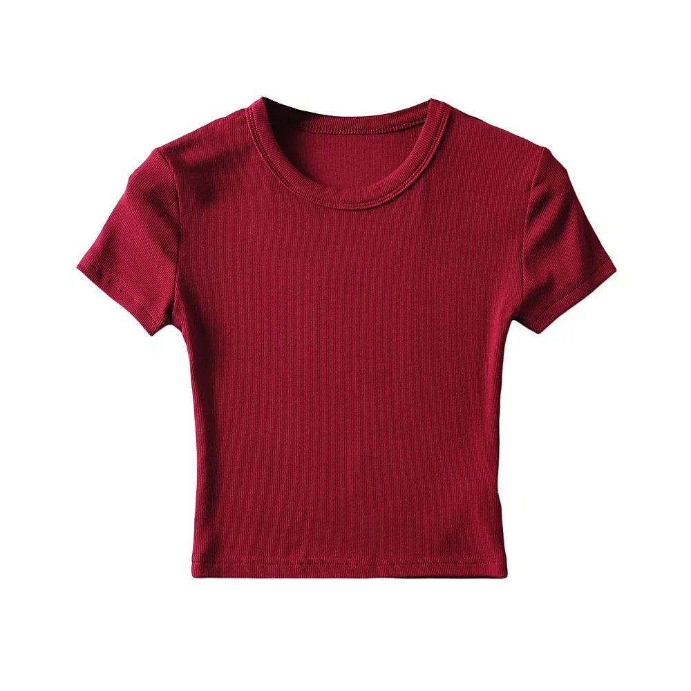 아메리칸 여름 새로운 8 색 하이 웨이스트 스트레치 슬림핏 와이드 챙 라운드 넥 반팔 티셔츠 여성용 솔리드 컬러 타이트 크롭 탑 트렌디