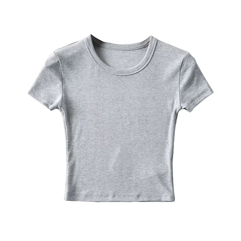 아메리칸 여름 새로운 8 색 하이 웨이스트 스트레치 슬림핏 와이드 챙 라운드 넥 반팔 티셔츠 여성용 솔리드 컬러 타이트 크롭 탑 트렌디스토어 가기