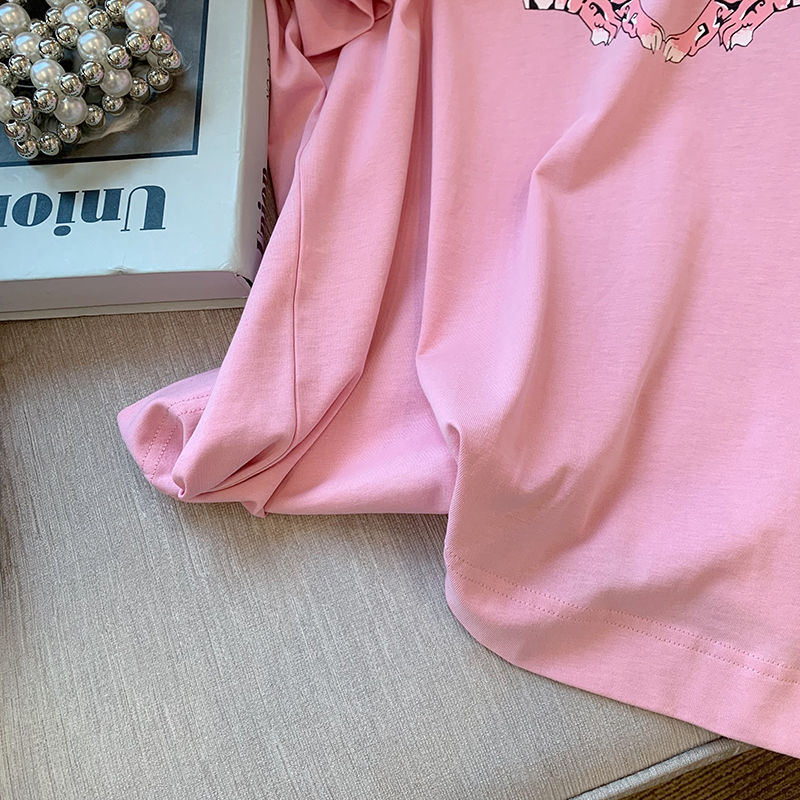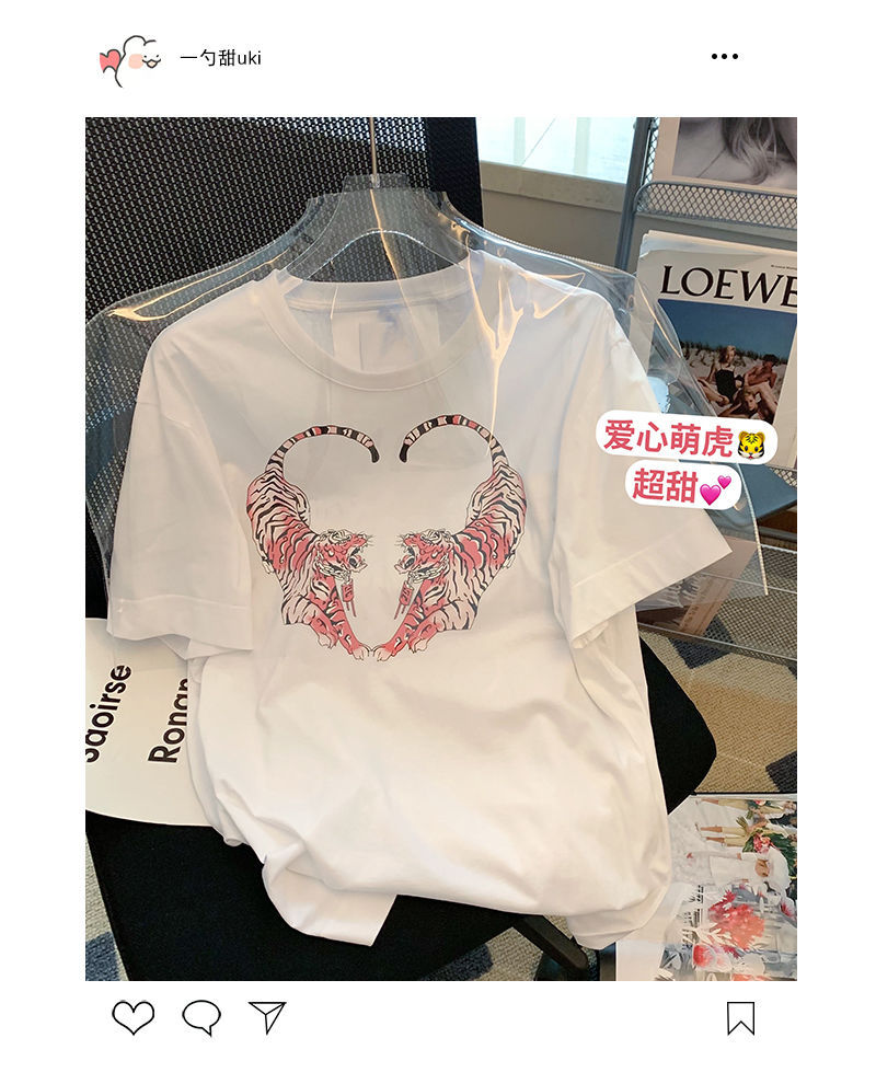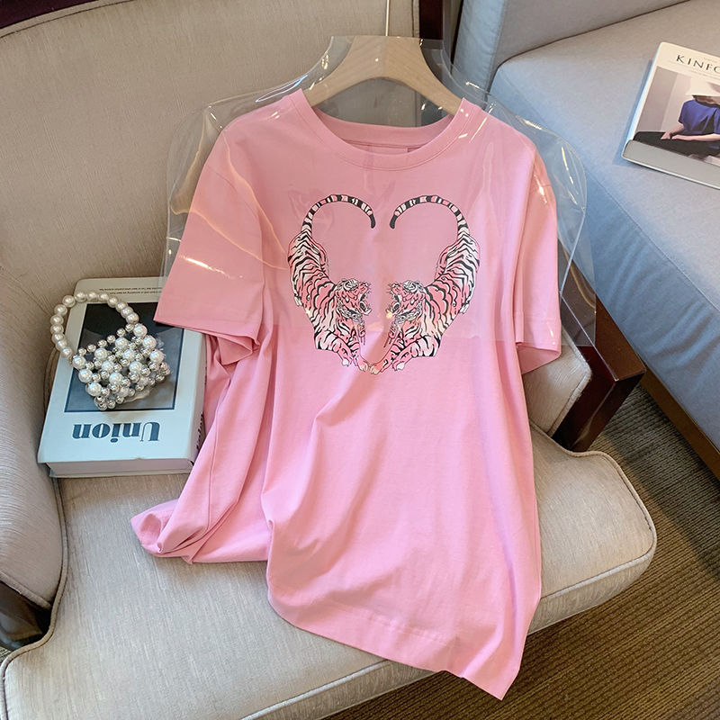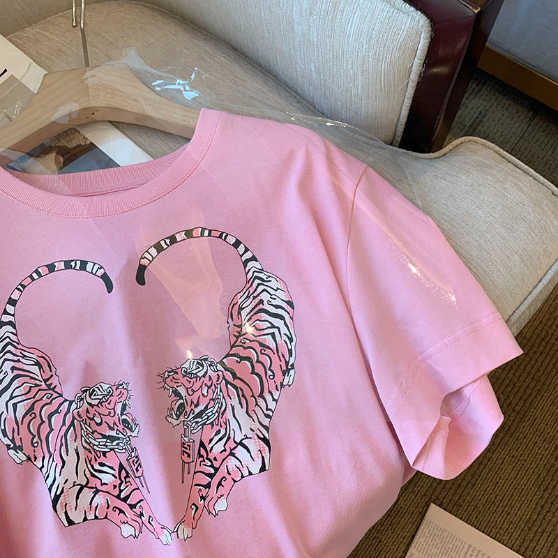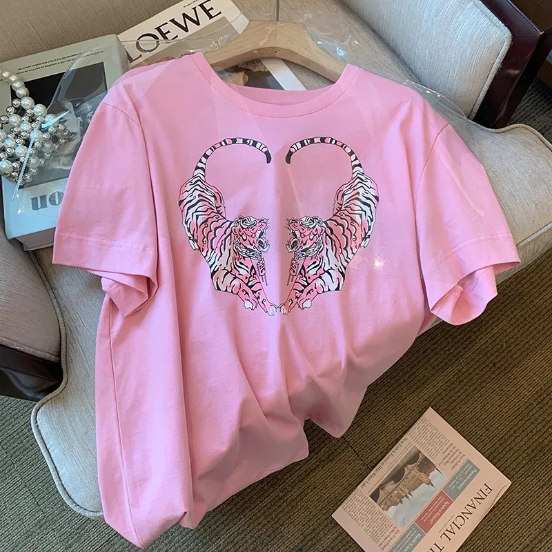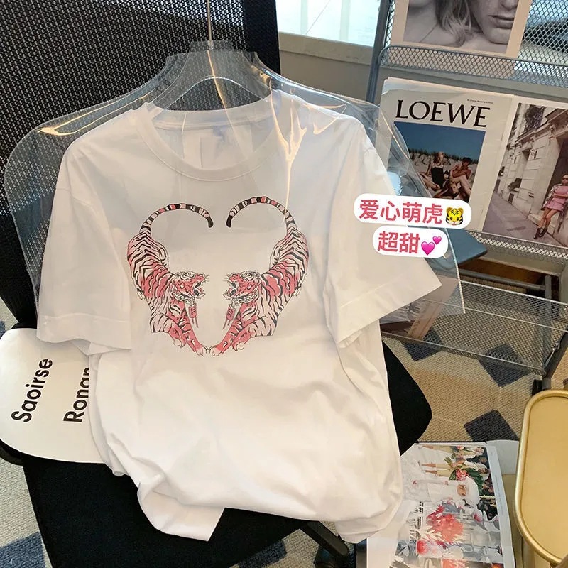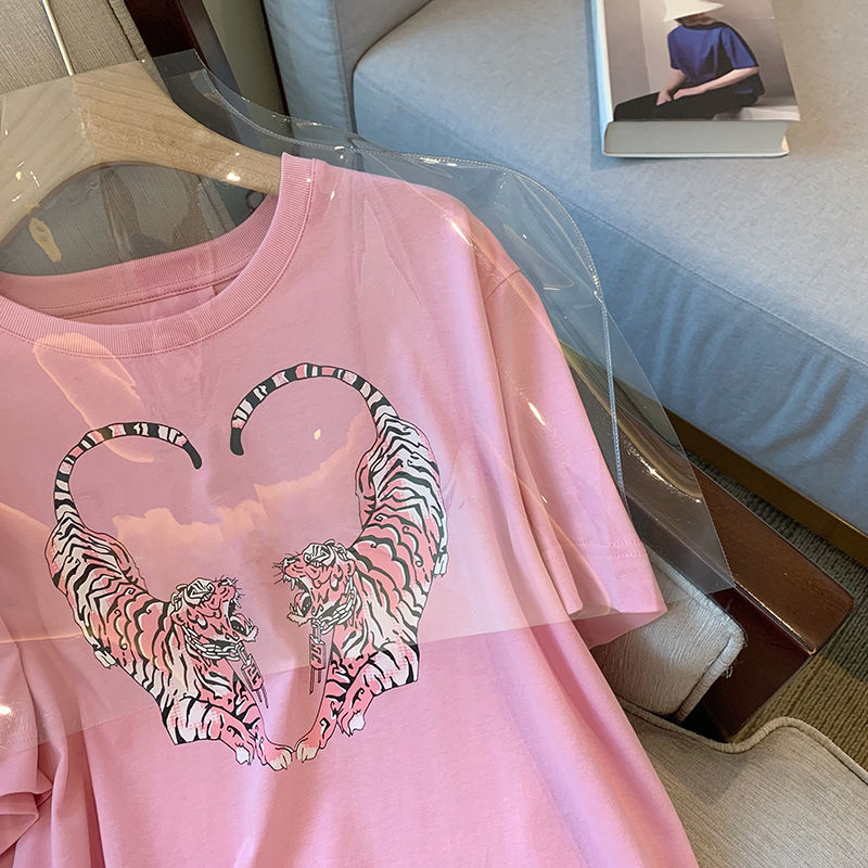 2022 여름 새로운 한국 스타일 플러스 사이즈 통통녀 1.00 kg-150.00 kg 반팔 티셔츠 여성용 타이거 프린트 느슨한 반 소매 탑스토어 가기