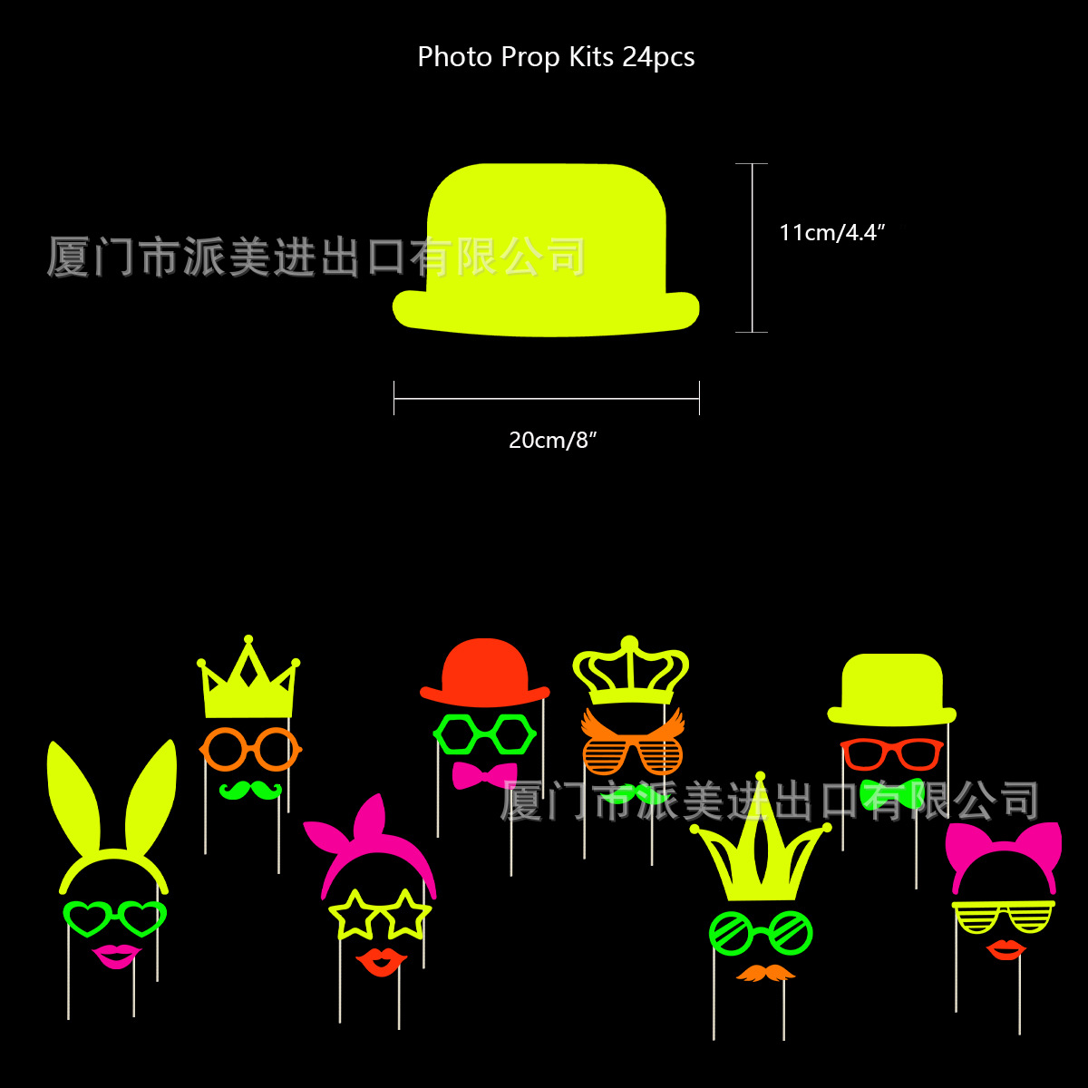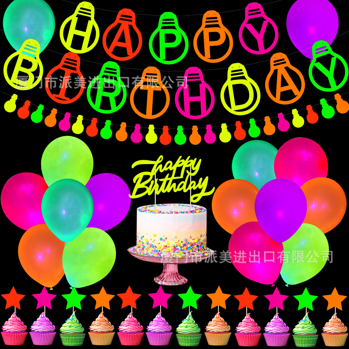1条拉旗+1条2米24片纸串+15个乳胶气球 +1组拍照道具+10个帽子+12个插旗+1个插排+6个螺旋吊卡
